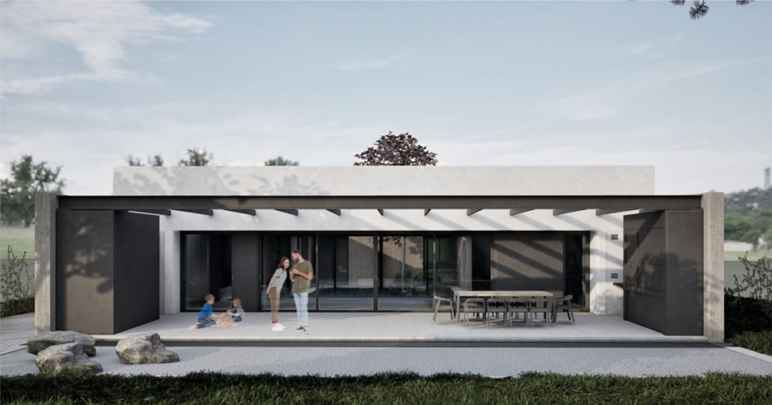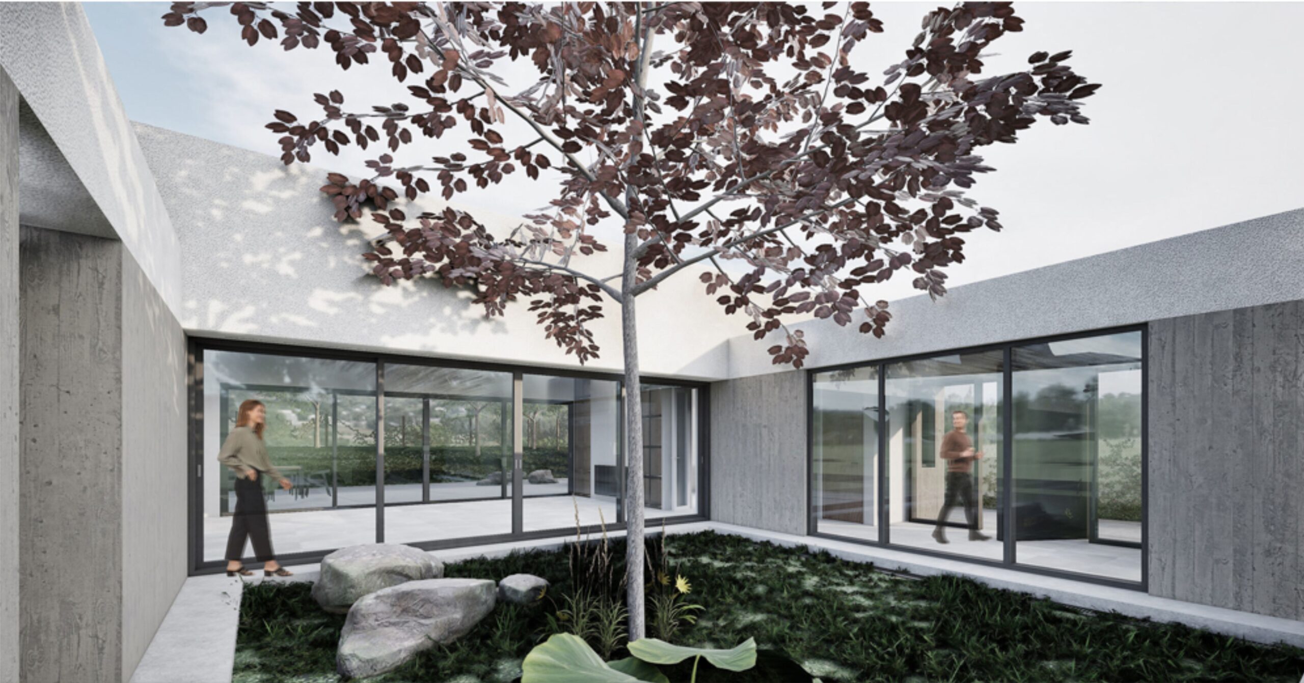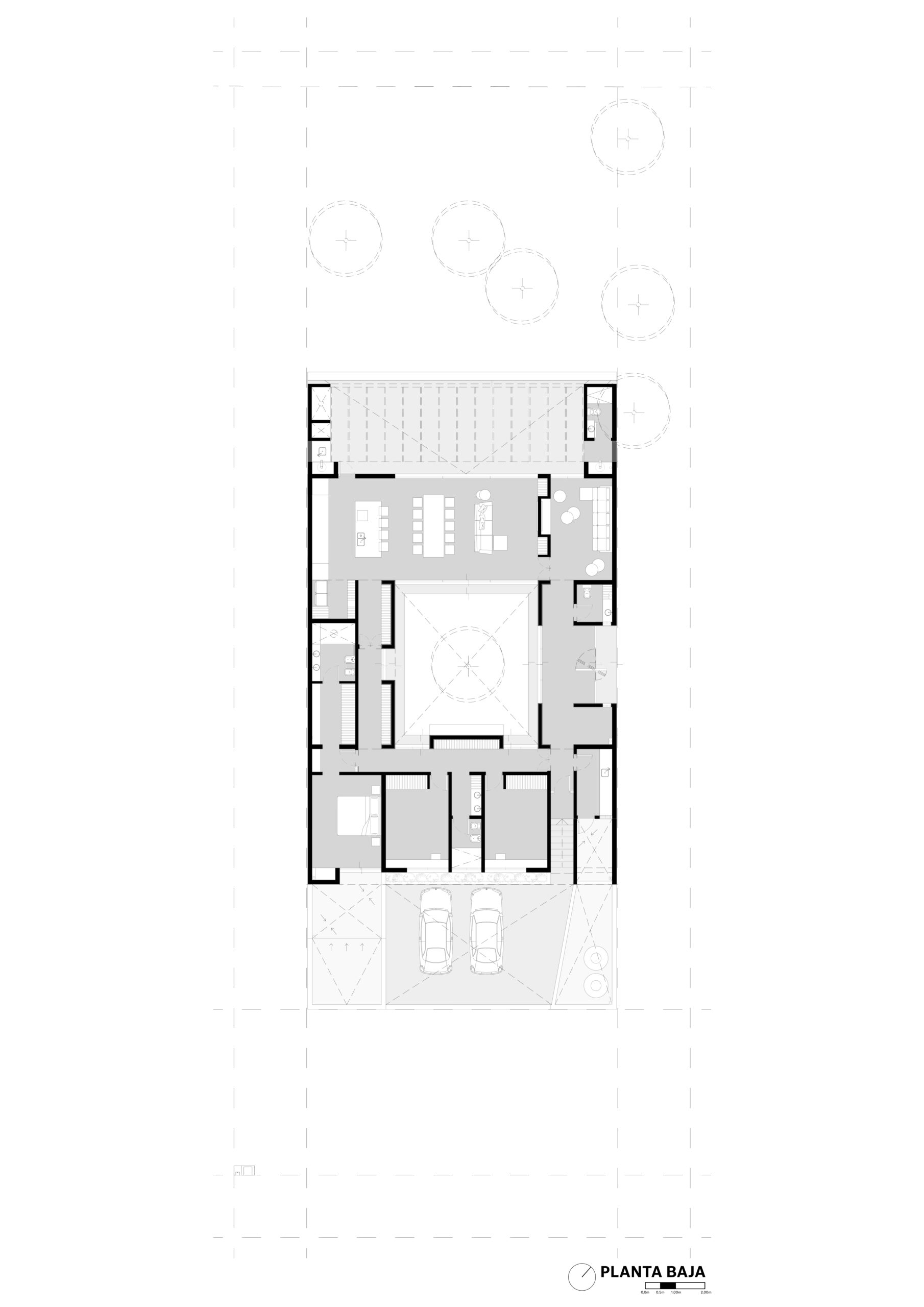 La casa tipológicamente es un claustro a donde un patio central se encargar de organizar el programa. Al incorporarle vegetación se crea un pulmón verde que, distancia y aísla los ruidos propios de la vida en familia. A su vez, este patio interno actúa como un espacio de transición y expansión de las actividades diarias proporcionando un entorno ideal para el juego de los niños, favoreciendo su interacción dentro de un ámbito protegido. Los muros que conforma dicho claustro cuentan con un guardado, por lo que funcionan mucho mejor ante las altas o bajas temperaturas que suceden en una zona de montaña. La vivienda finalmente queda relacionada con una sucesión de patios que dan continuidad entre interior-exterior a donde se requiere y dotan de iluminación y ventilación cruzada a los distintos ambientes.