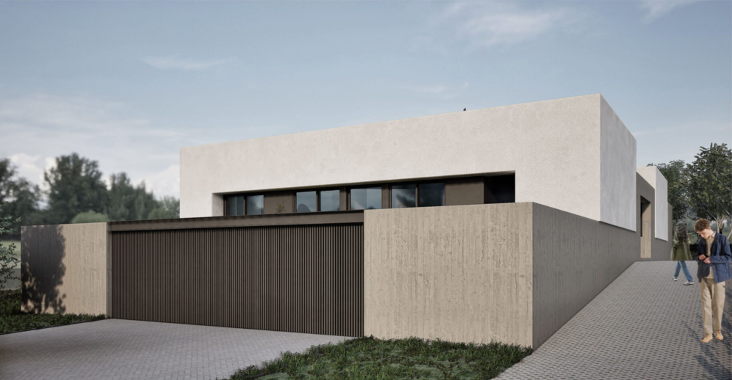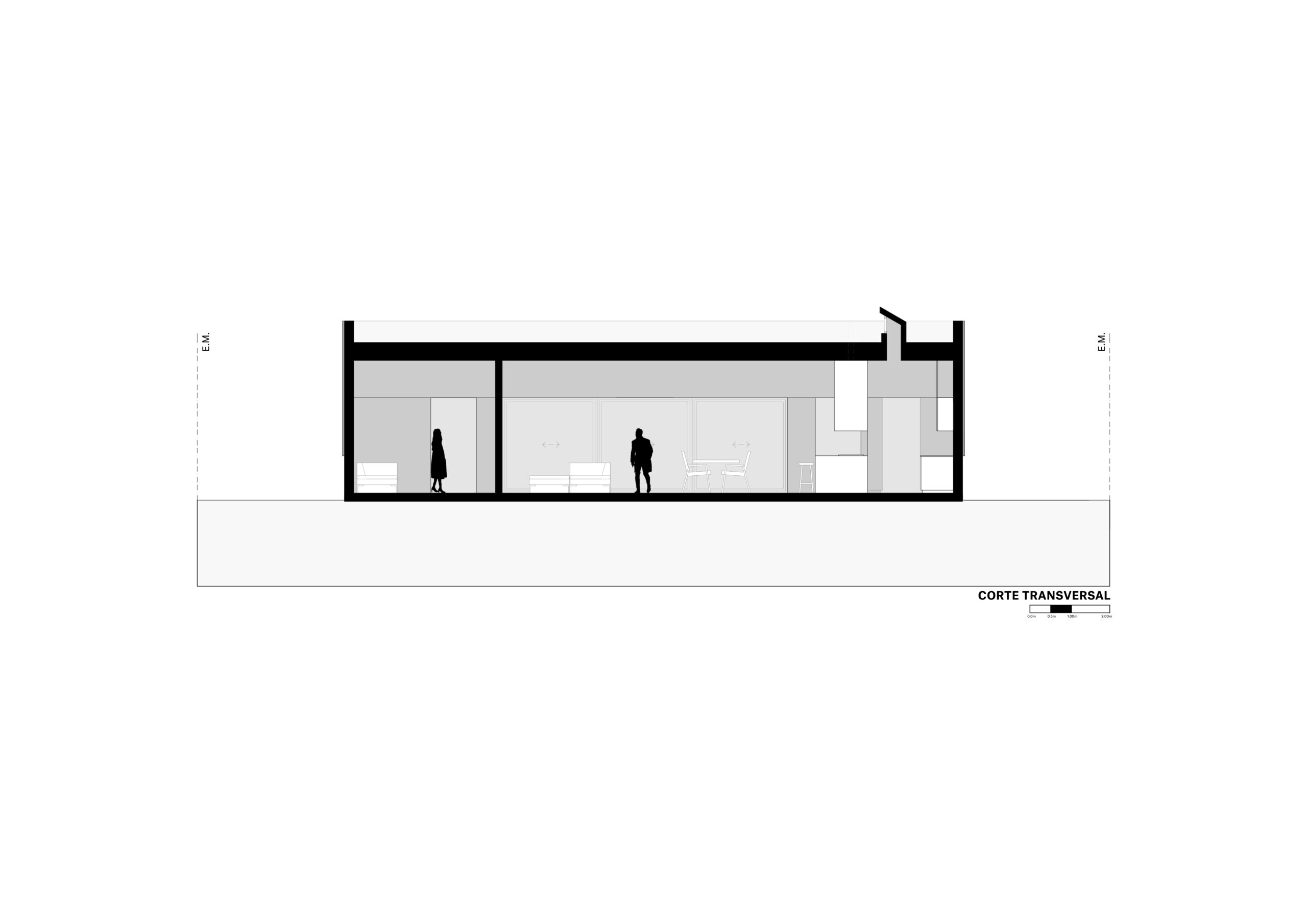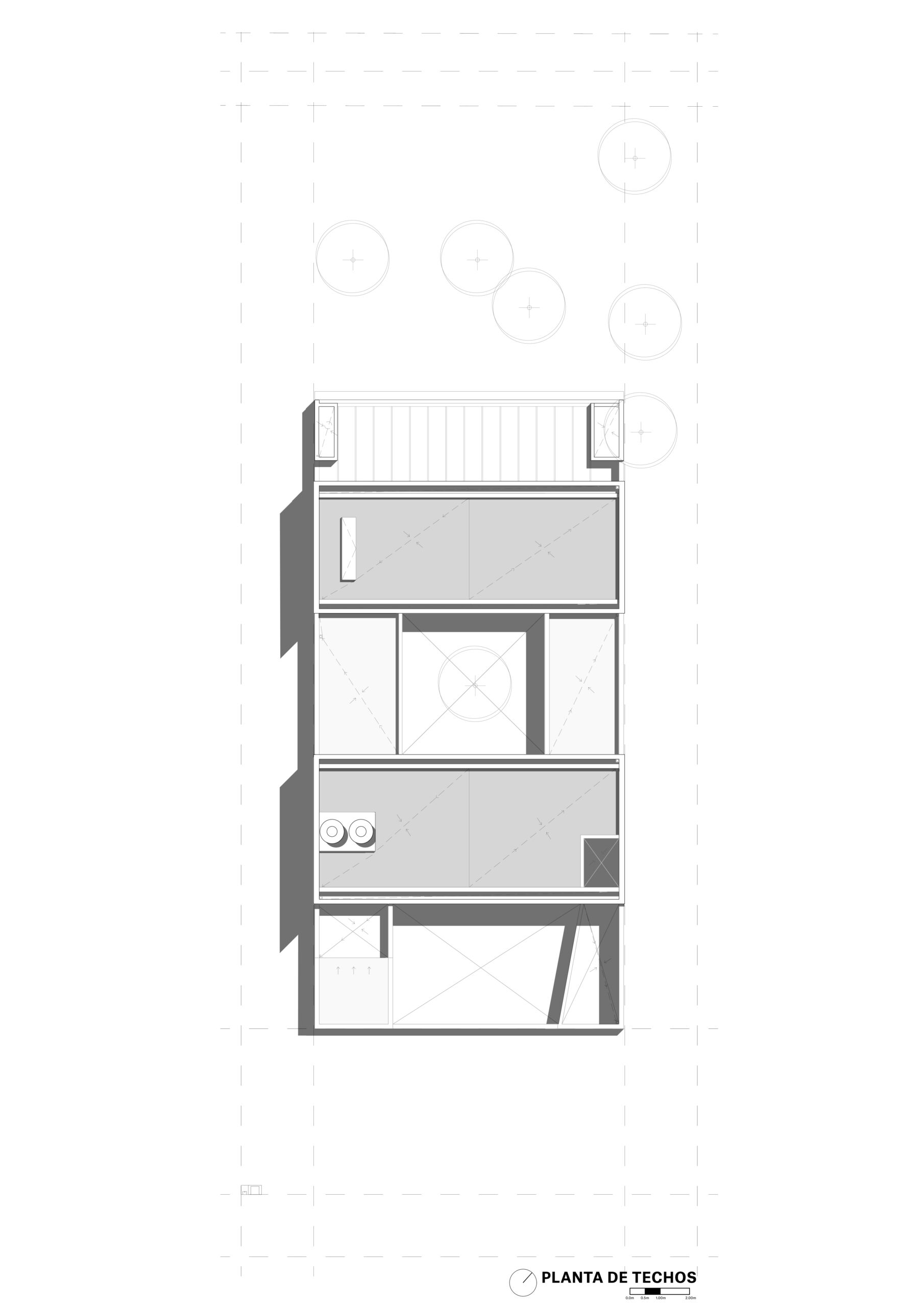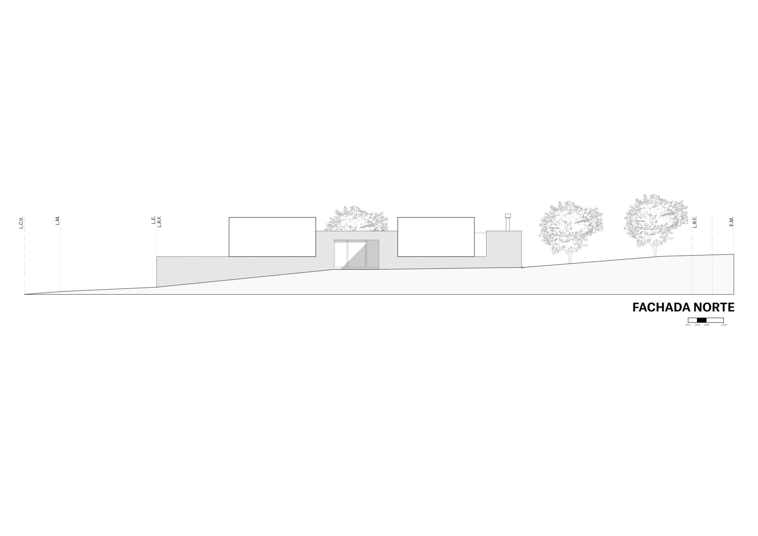 El encargo tenía la dificultad de organizar una casa a donde la vida se desarrolla únicamente en una planta sin desniveles, pero, implantándose en un lote inclinado. Por lo que decidimos dividir el programa en dos: garaje, cisternas y guardado a nivel calle y luego, elevado el resto de la vivienda. De tal manera que los usuarios puedan llevar a cabo su día a día con desplazamientos sin escalones o rampas. Todo esto, respetando al máximo la vegetación autóctona si remover los árboles existentes.