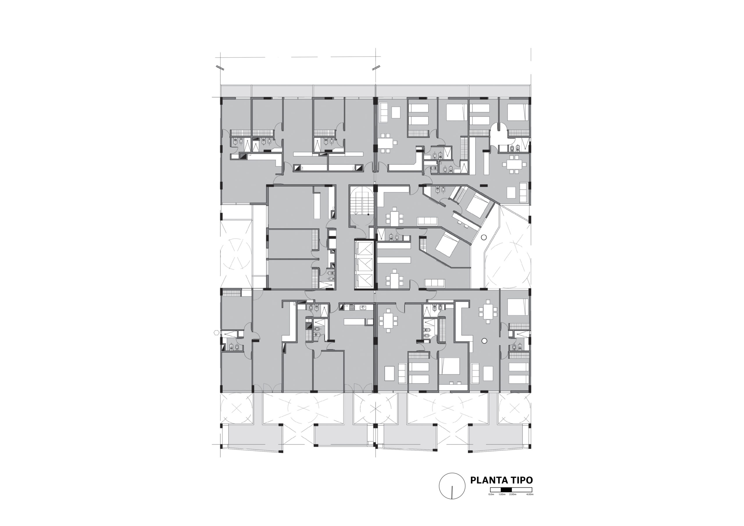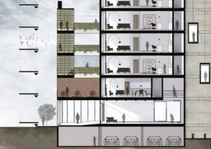 Se utiliza a favor la situación de los vecinos colindantes a donde uno sólo materializa un porcentaje del perfil normativo y el otro un edificio bajo de la década del los 70´, que responde a una normativa anterior a donde la apropiación del lote no tenía en cuenta el perfil y centro de manzana, por lo que cuenta con 2 pisos y se extiende en toda la superficie de la parcela. Todo esto ayuda a potenciar la luz, ventilación y vistas tanto de las terrazas como de las unidades mismas.