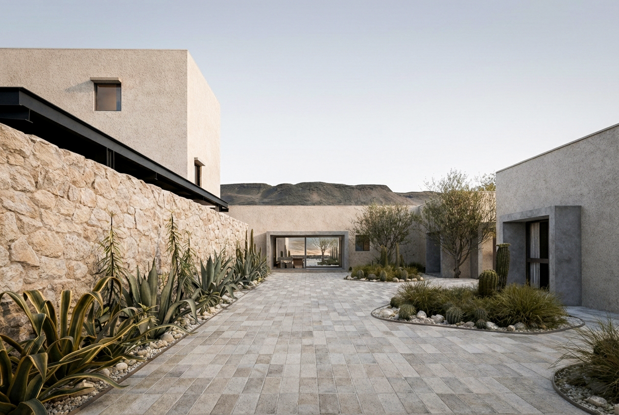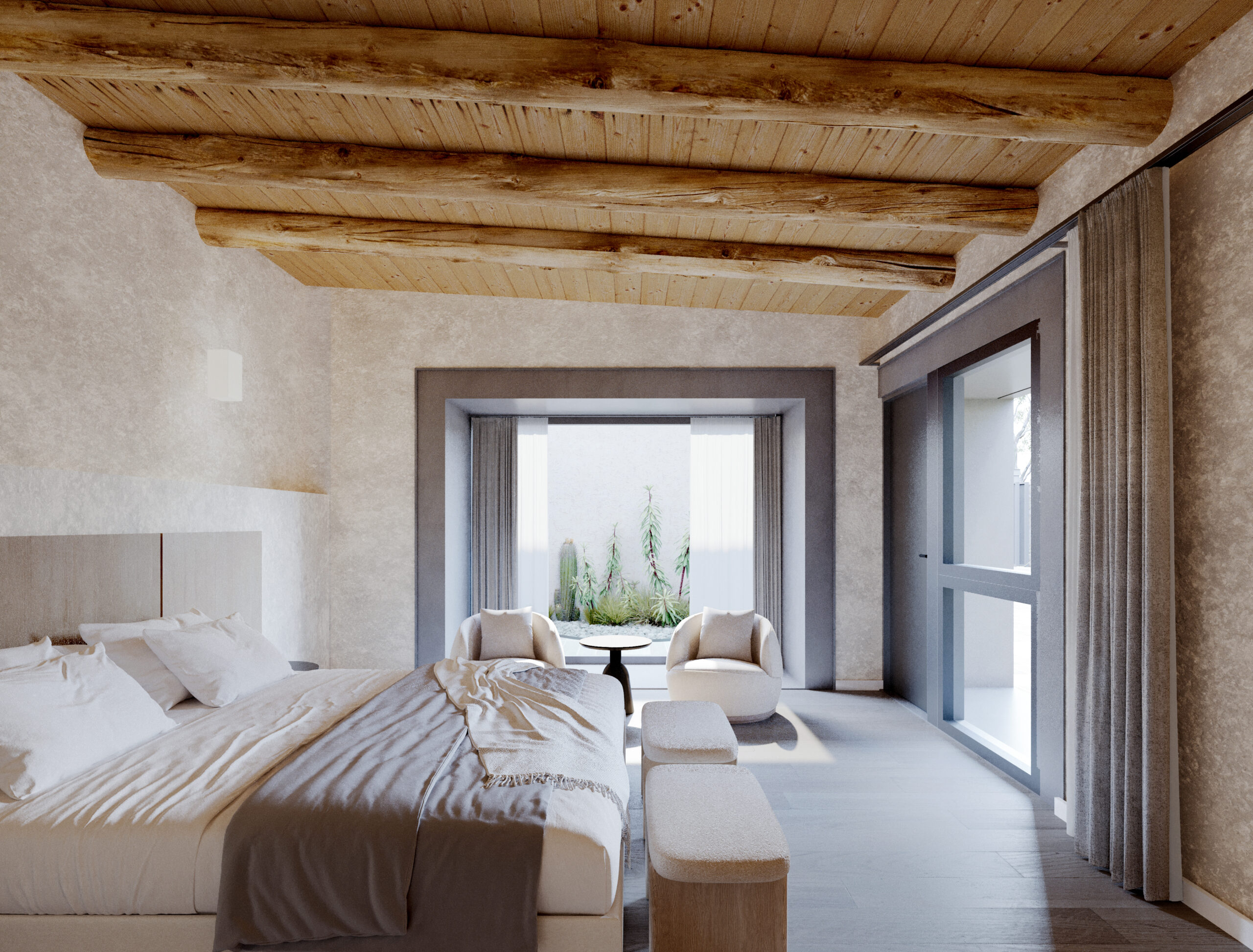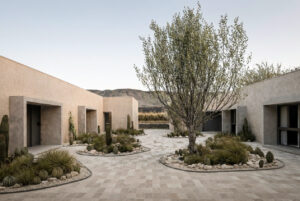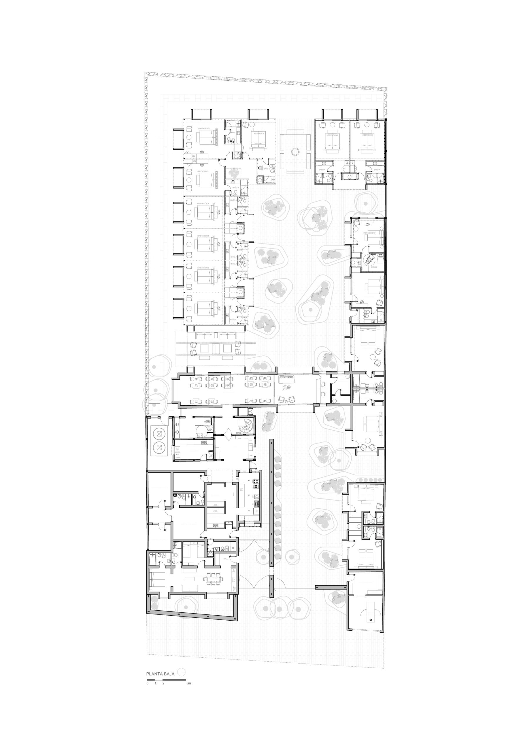 La implantación se ordena mediante un eje longitudinal que articula acceso, espacios públicos y visuales hacia el paisaje. Dos muros de piedra separan claramente las áreas públicas, de servicio y la circulación interna del hotel. Se prescinde de una habitación al Oeste que abre el claustro para garantizar una visual continua desde el ingreso hasta el fondo del predio, permitiendo visuales extendidas desde el ingreso.