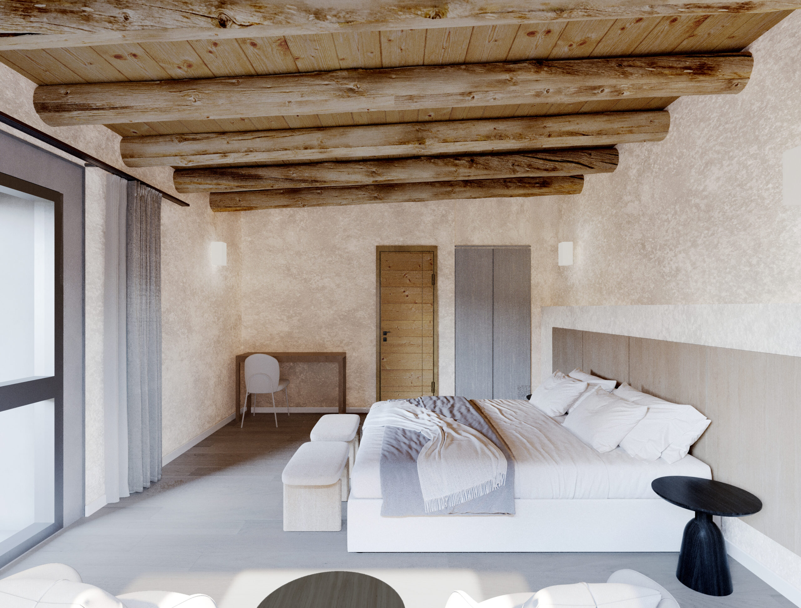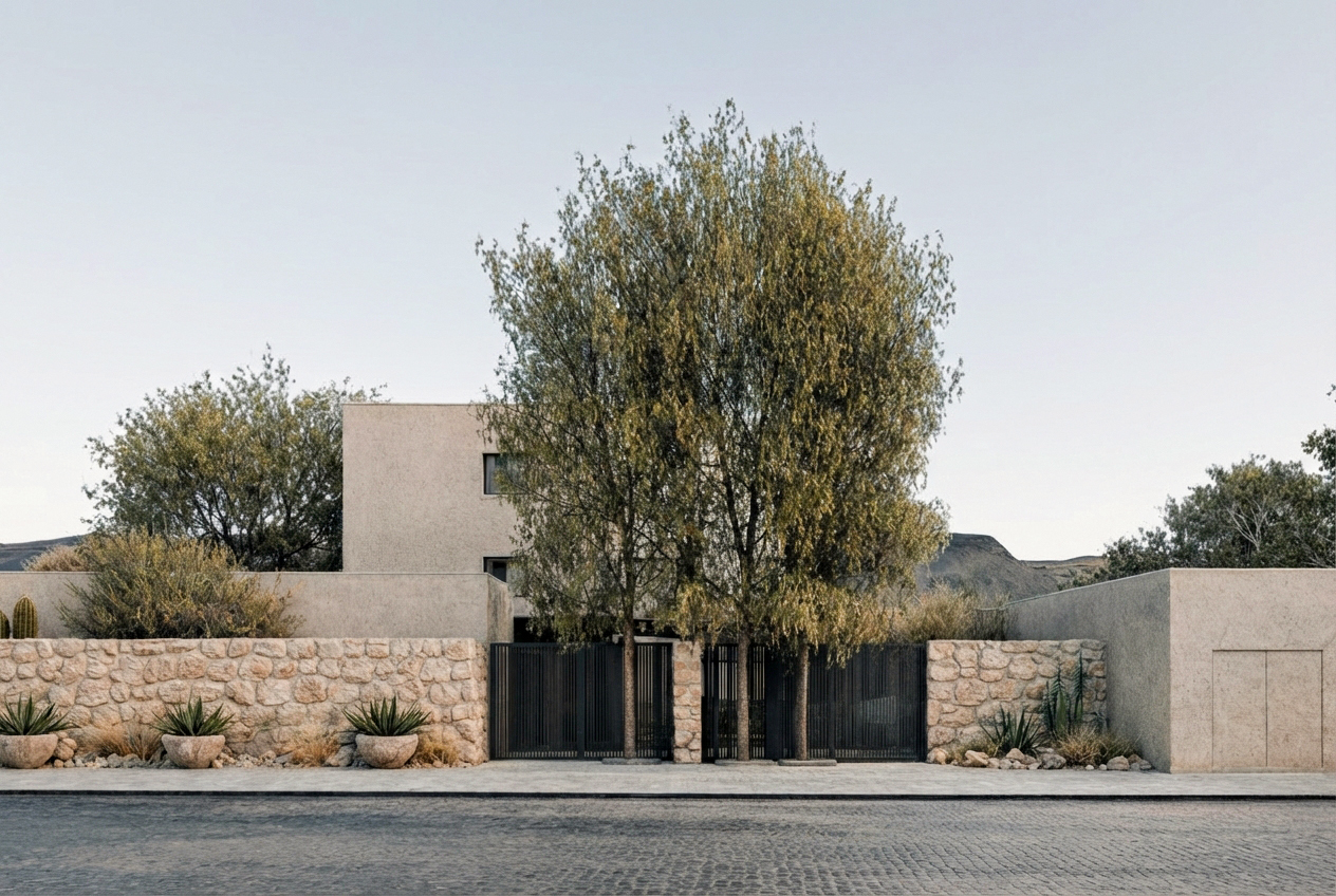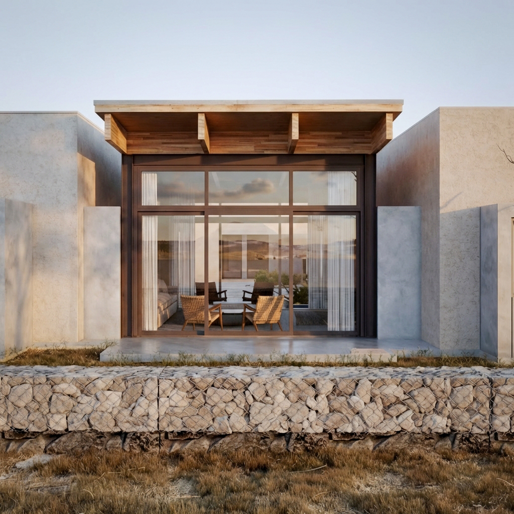 La implantación se ordena mediante un eje longitudinal que articula acceso, espacios públicos y visuales hacia el paisaje. Dos muros de piedra separan claramente las áreas públicas, de servicio y la circulación interna del hotel. Se prescinde de una habitación al Oeste que abre el claustro para garantizar una visual continua desde el ingreso hasta el fondo del predio, permitiendo visuales extendidas desde el ingreso.