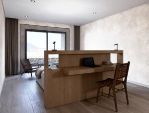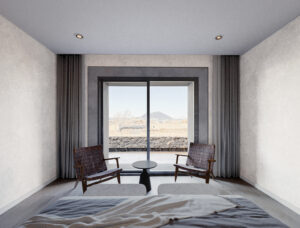 Las habitaciones se disponen perimetralmente, orientadas hacia los volcanes y formaciones montañosas. Un mueble integrado resuelve el equipamiento interior, permitiendo que las camas se orienten hacia las visuales principales y reduciendo la cantidad de elementos añadidos.