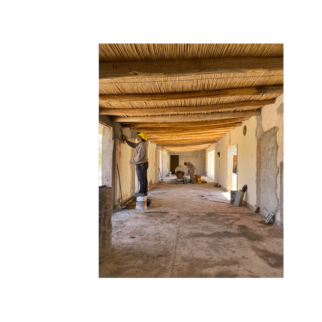 El edificio original, construido con muros portantes de adobe y fundaciones de piedra volcánica debido a la salinidad del suelo, requirió una intervención precisa que preservara su estabilidad estructural y su lógica constructiva original.