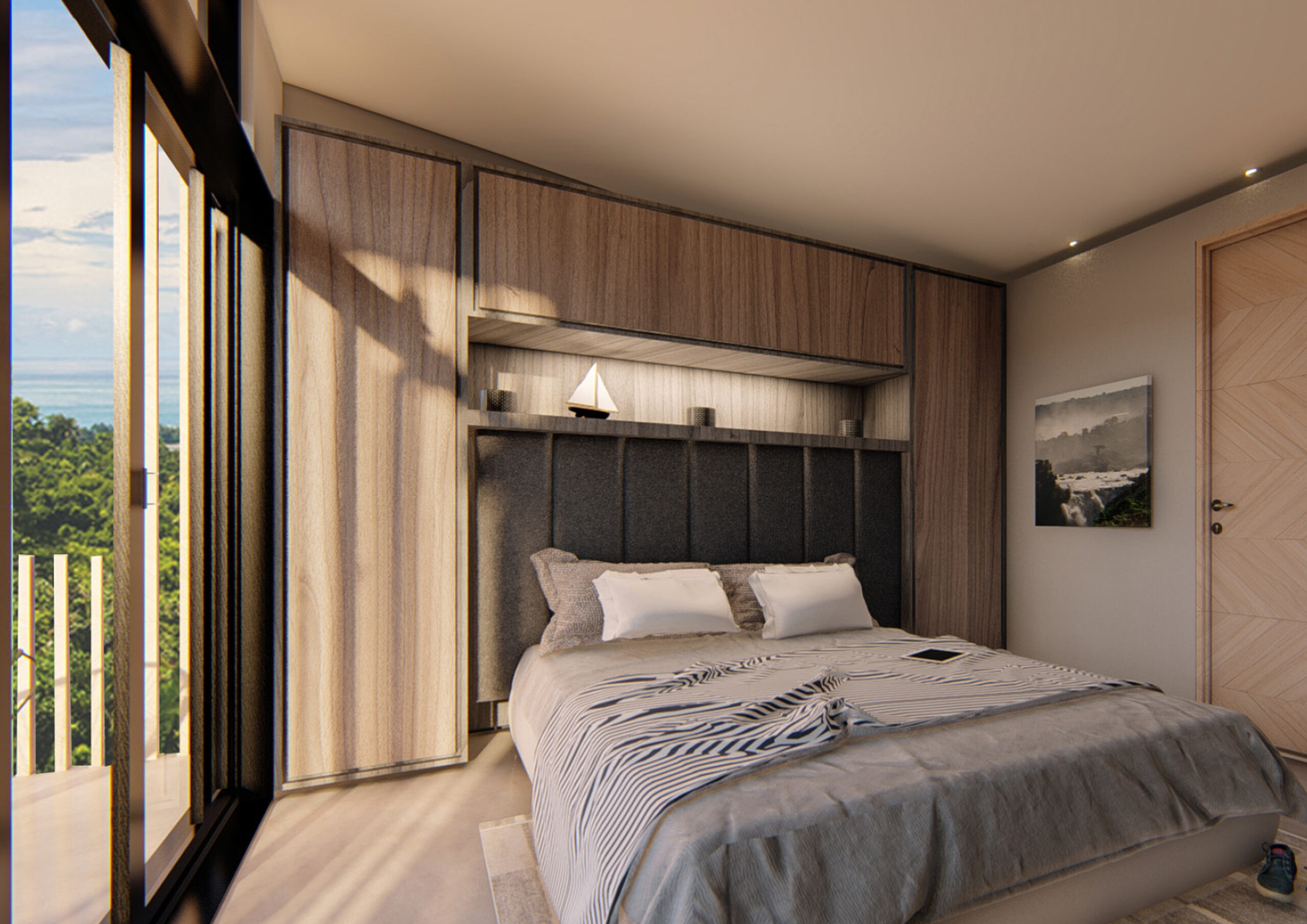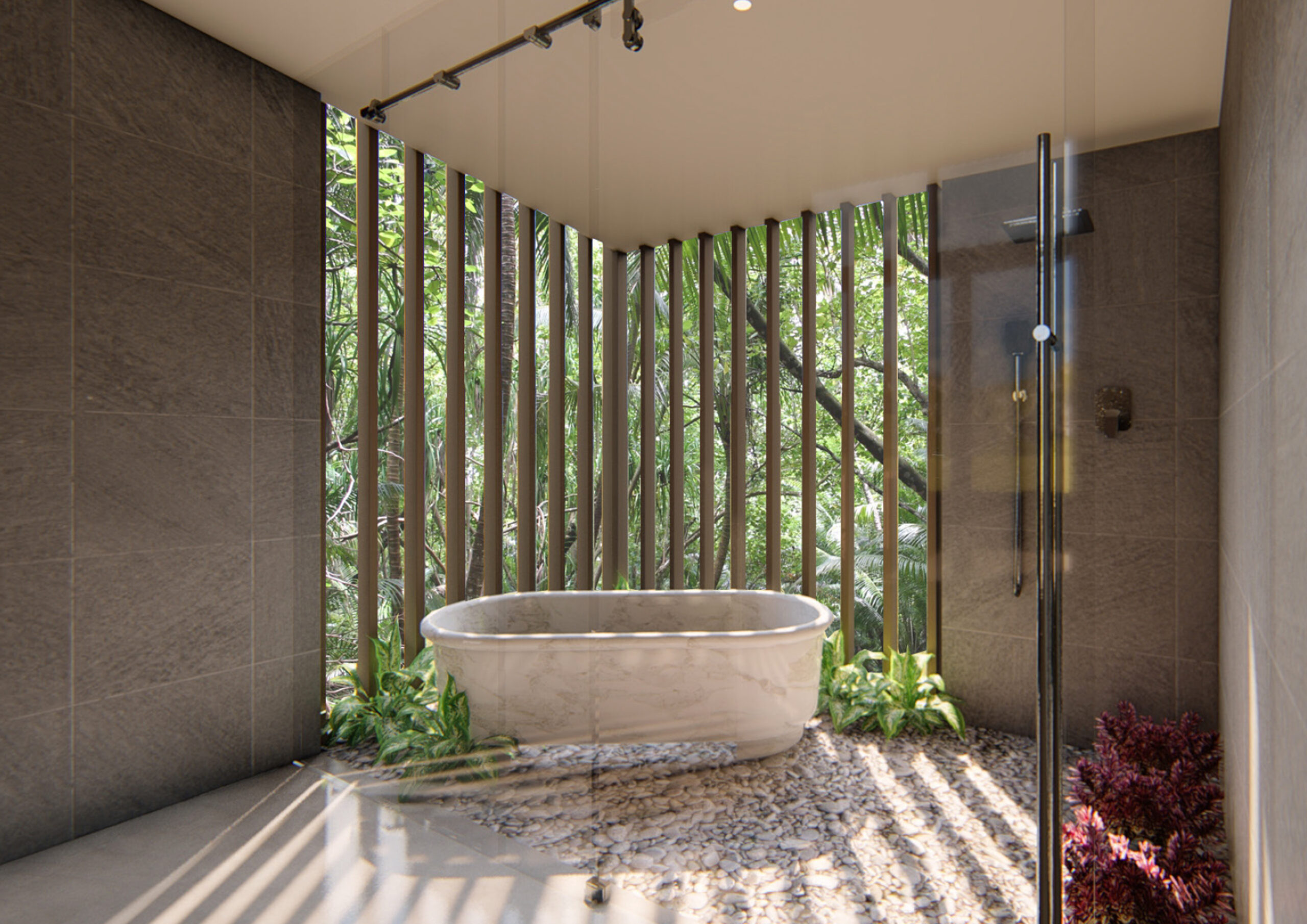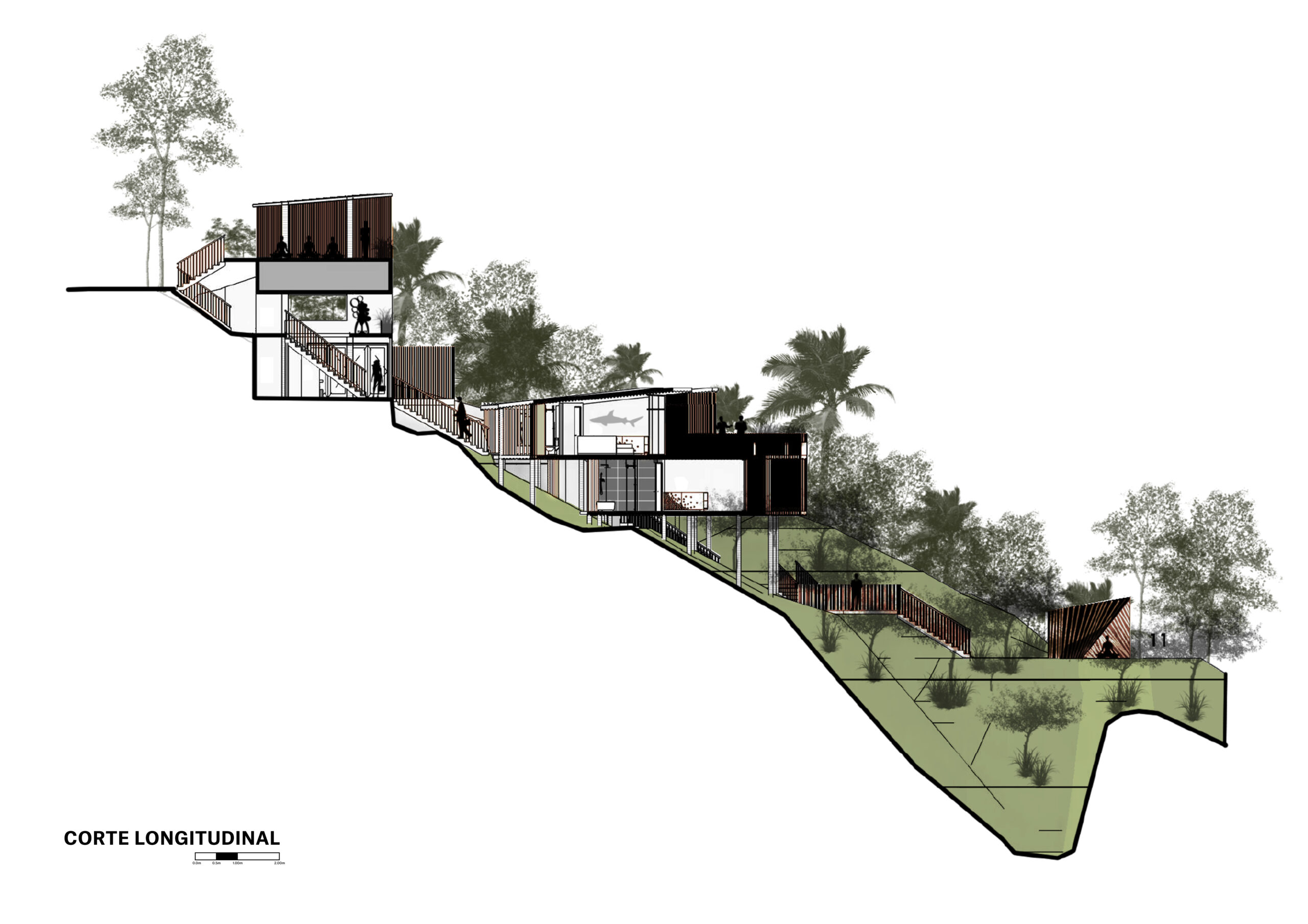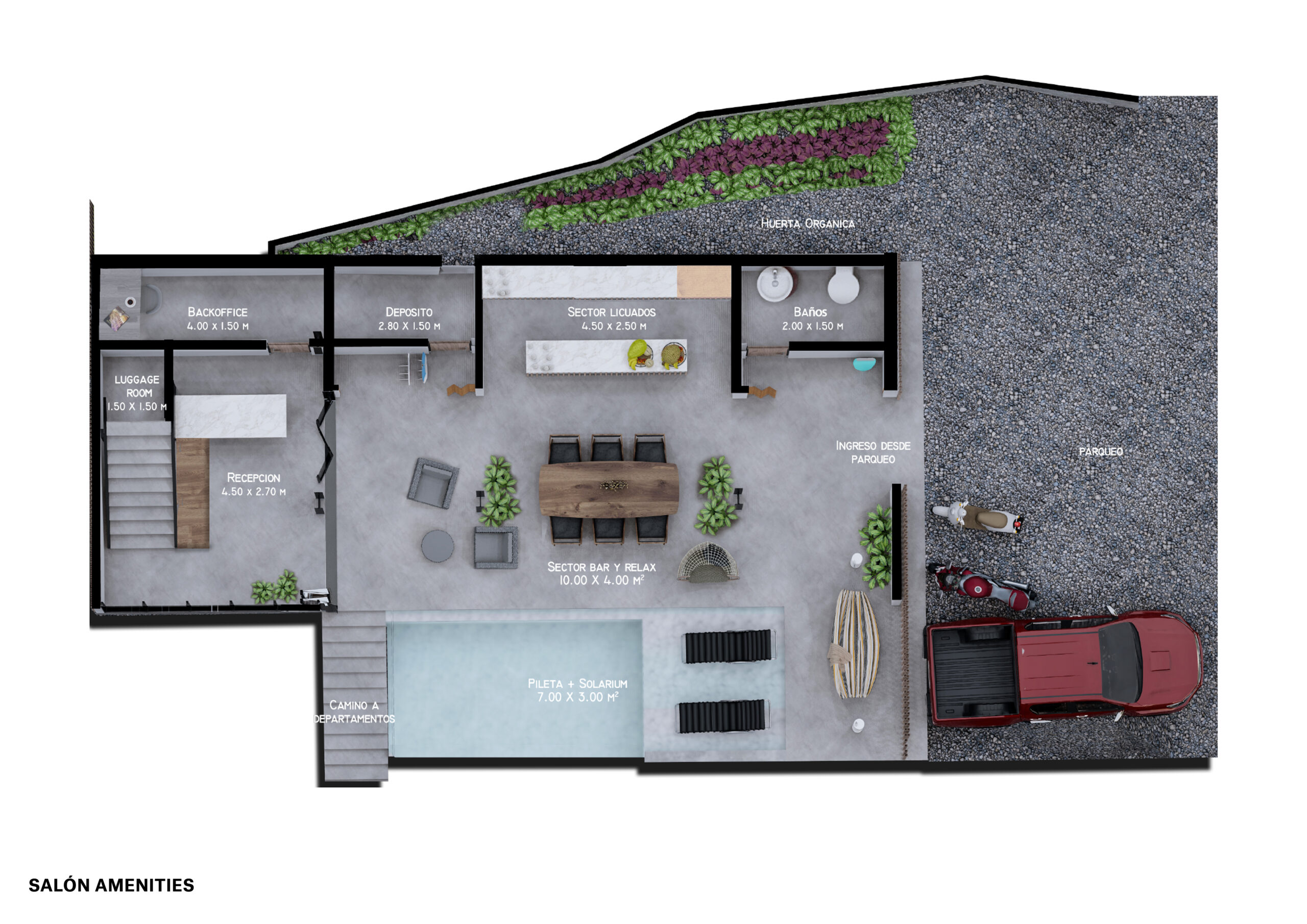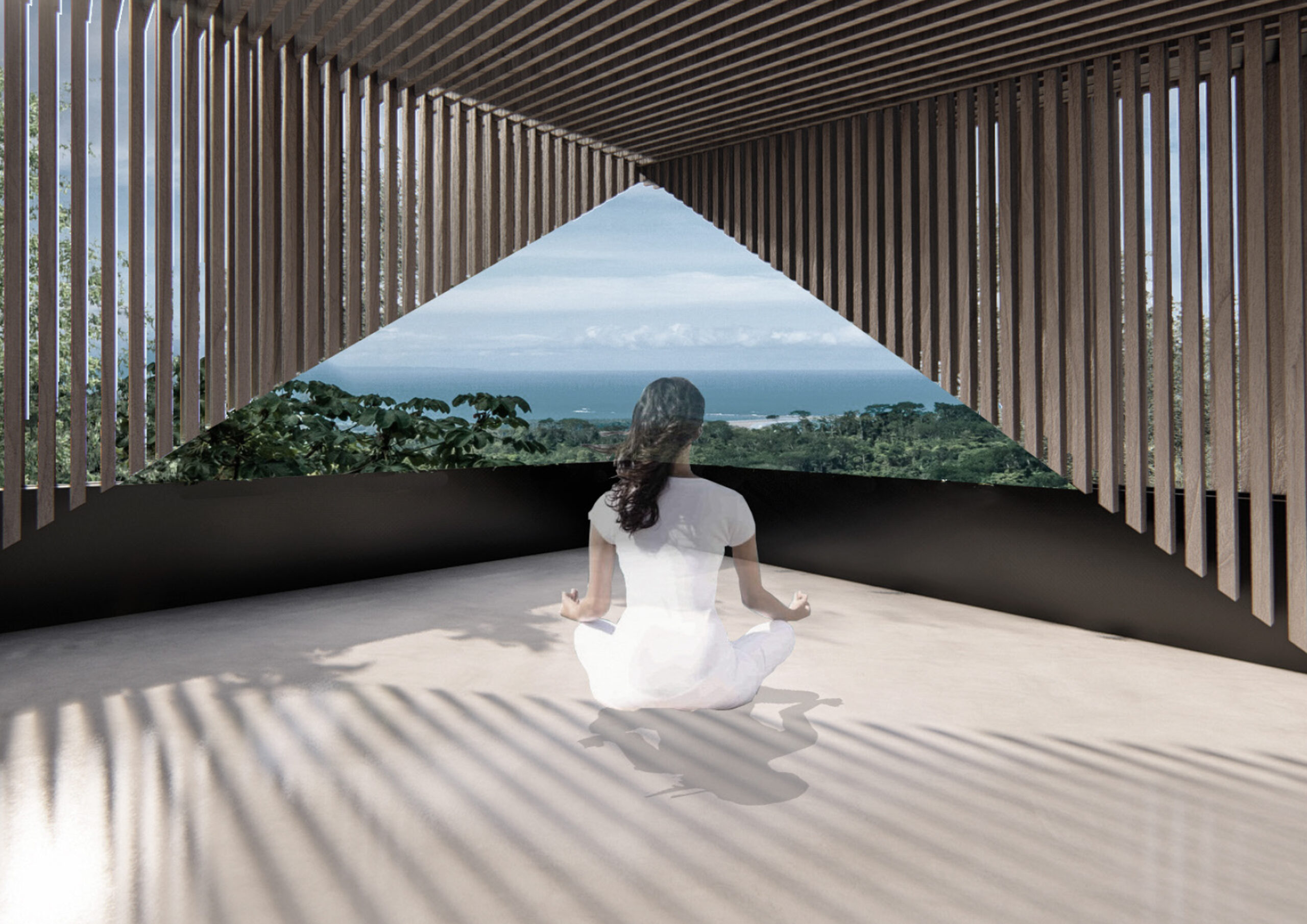 La zona pública incluye un mirador 360° con vistas al mar y la selva, recepción con vistas a la piscina, sector de bar y piscina infinita con vistas panorámicas. Se propone una segunda área de yoga en la selva para mayor intimidad y conexión con la naturaleza.