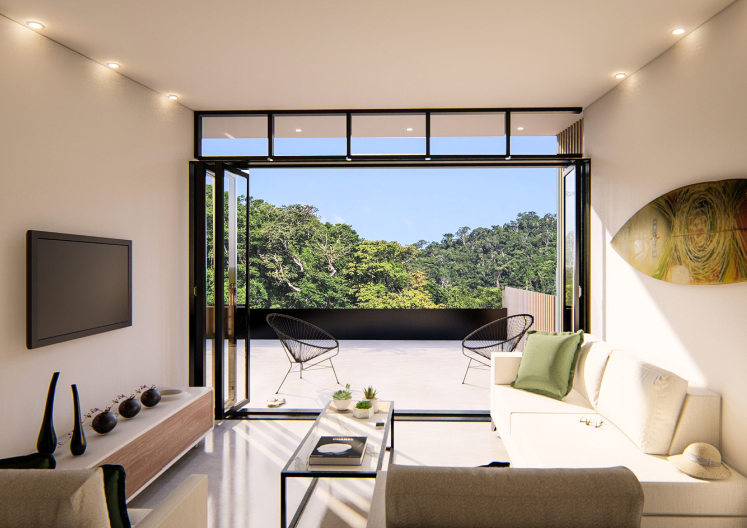 Los cuatro departamentos del hotel (dos Premium y dos Deluxe) pueden convertirse en seis habitaciones independientes para mayor flexibilidad. Cada uno cuenta con áreas para limpieza y almacenamiento de tablas de surf, cocina comedor multifunción, living (solo en los Deluxe), habitación, áreas al aire libre y baño con bañera conectada a la naturaleza. Se enfoca en la privacidad y vistas panorámicas tanto a la selva como al mar.