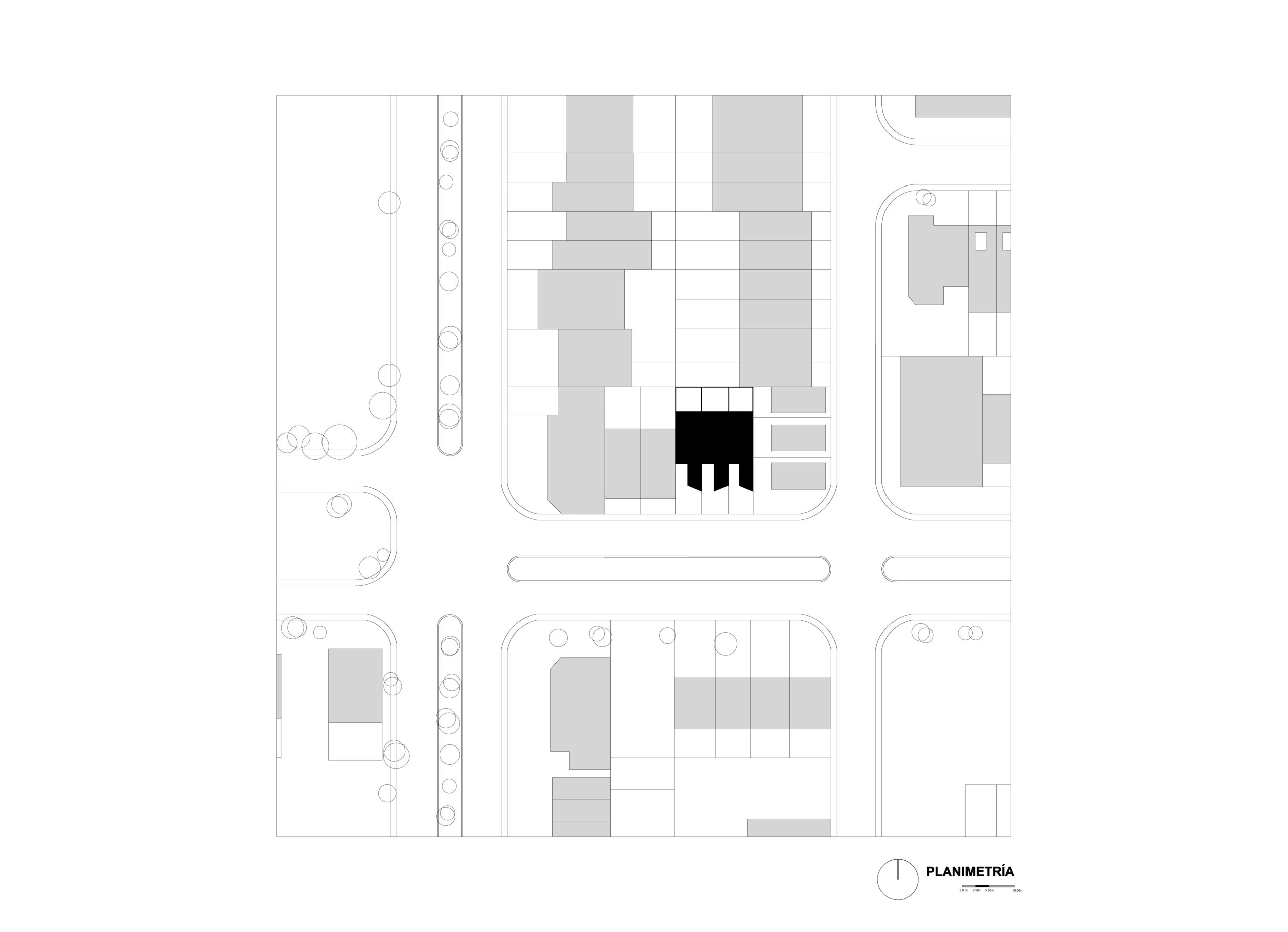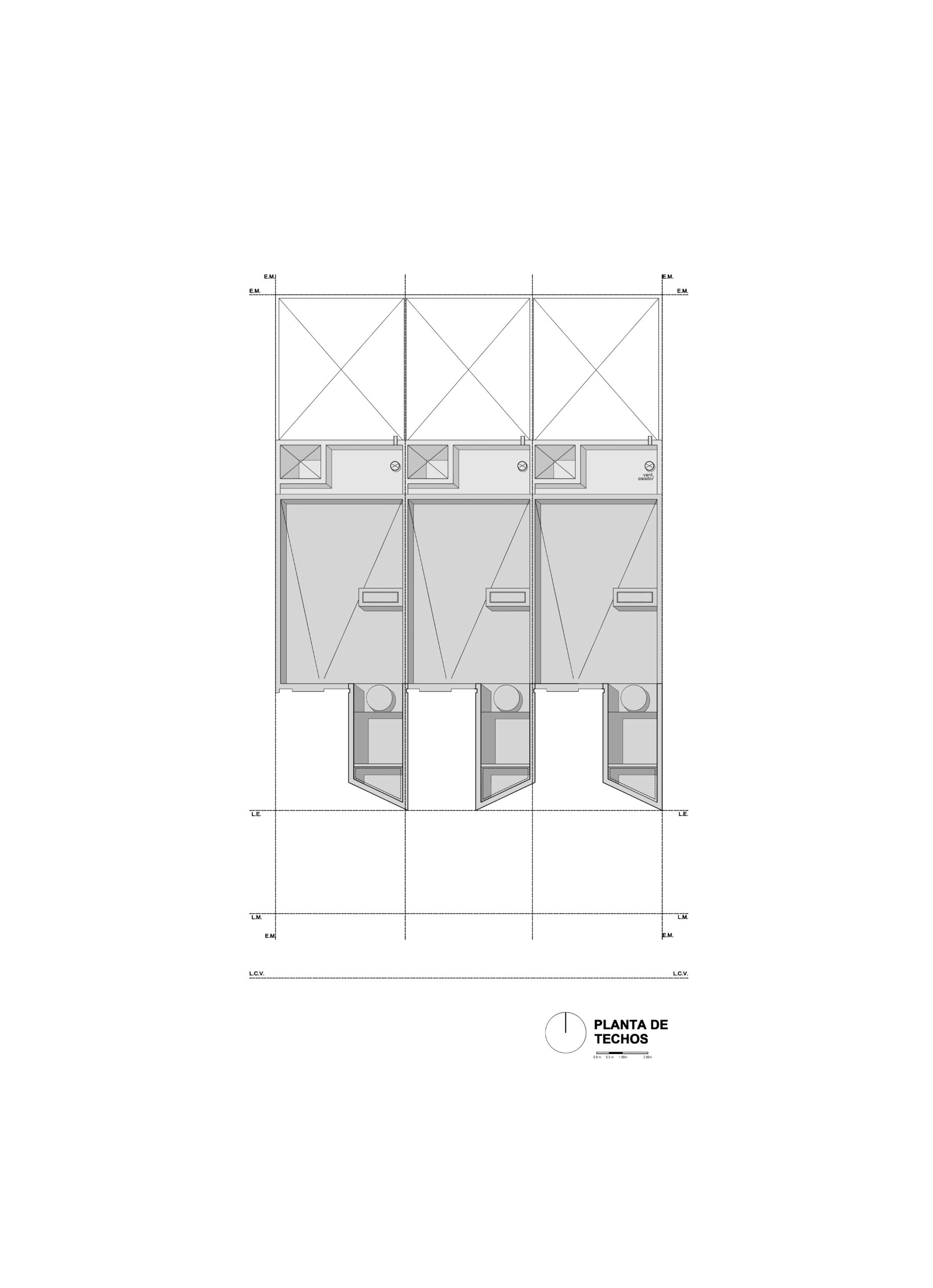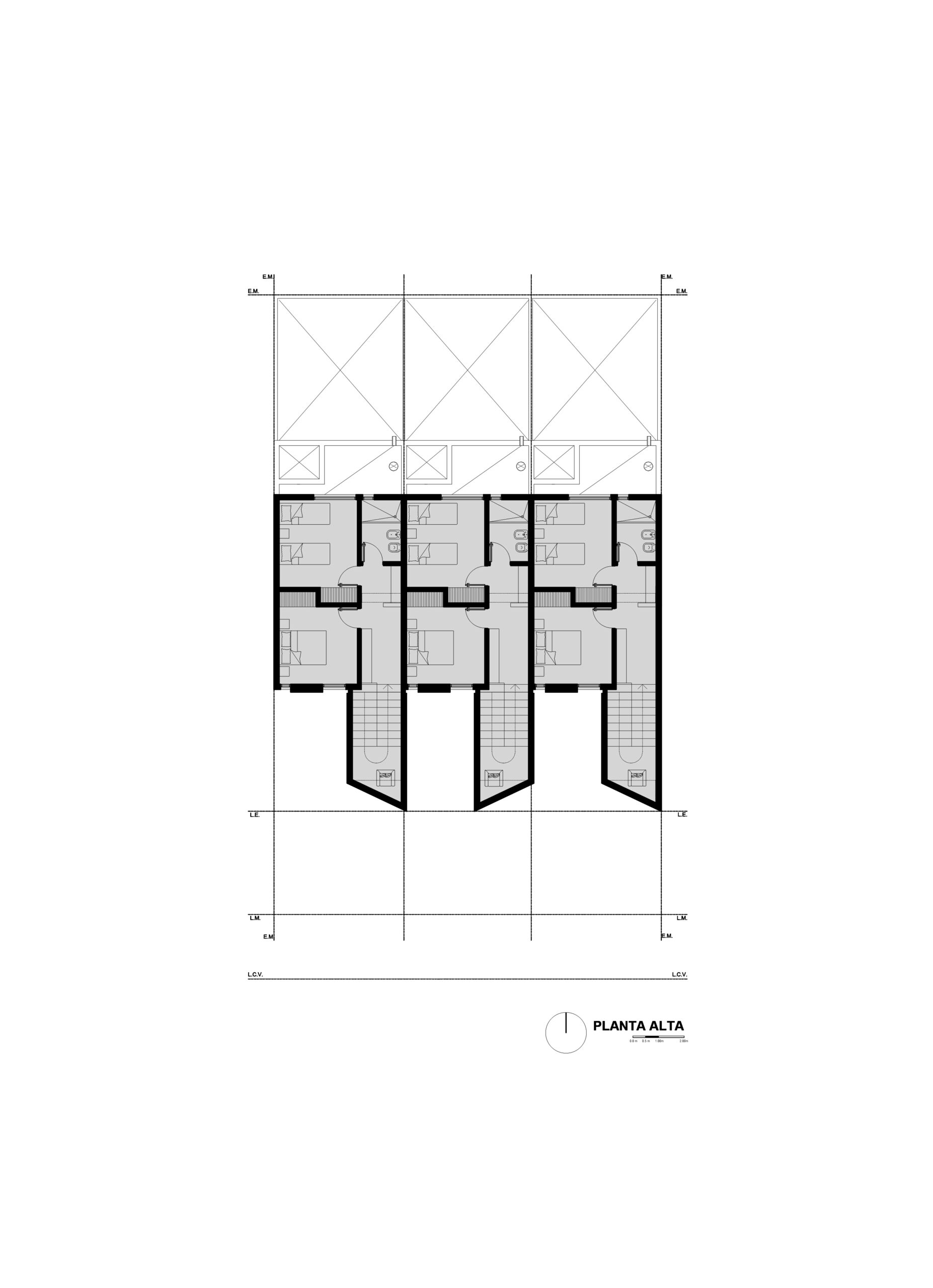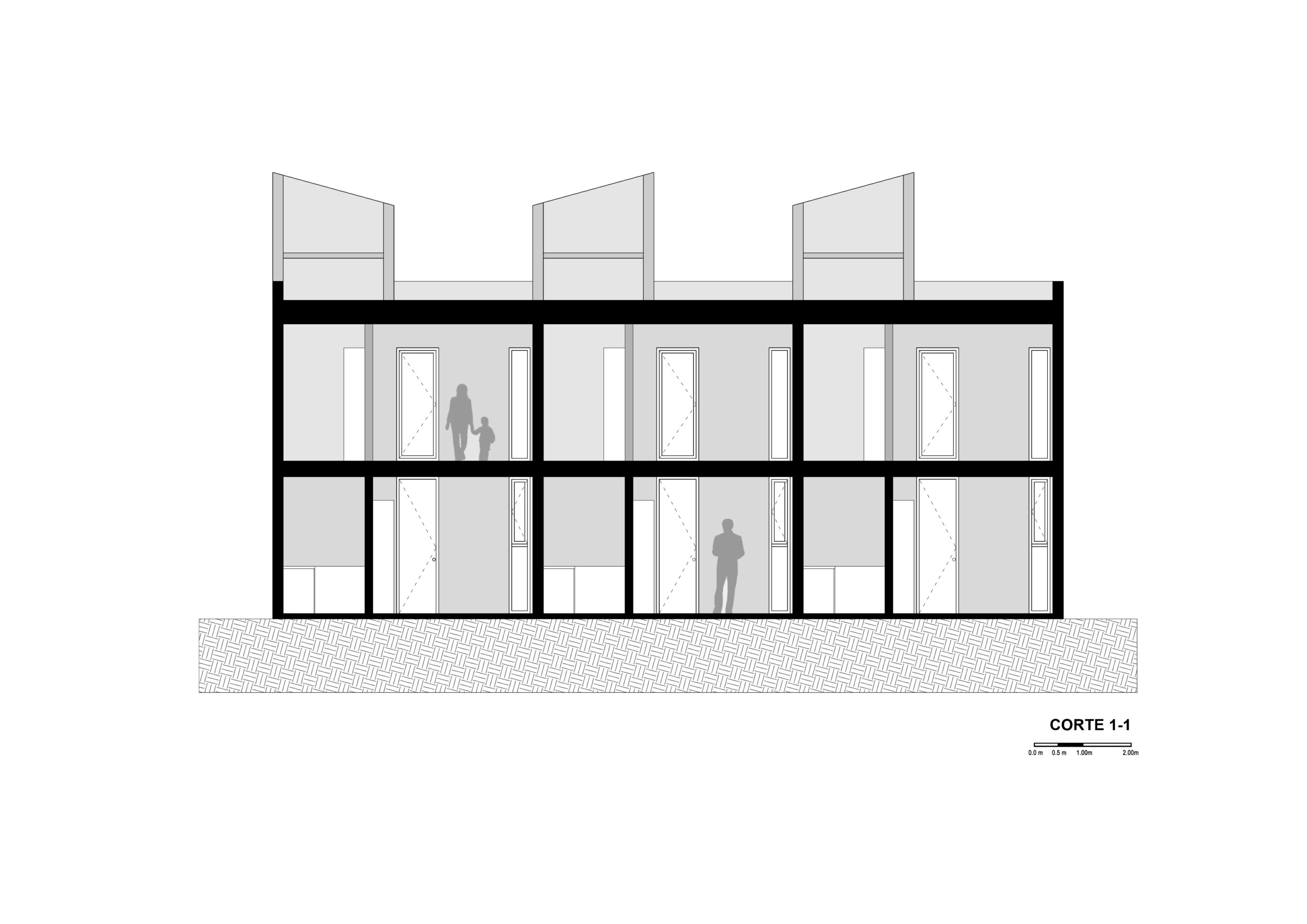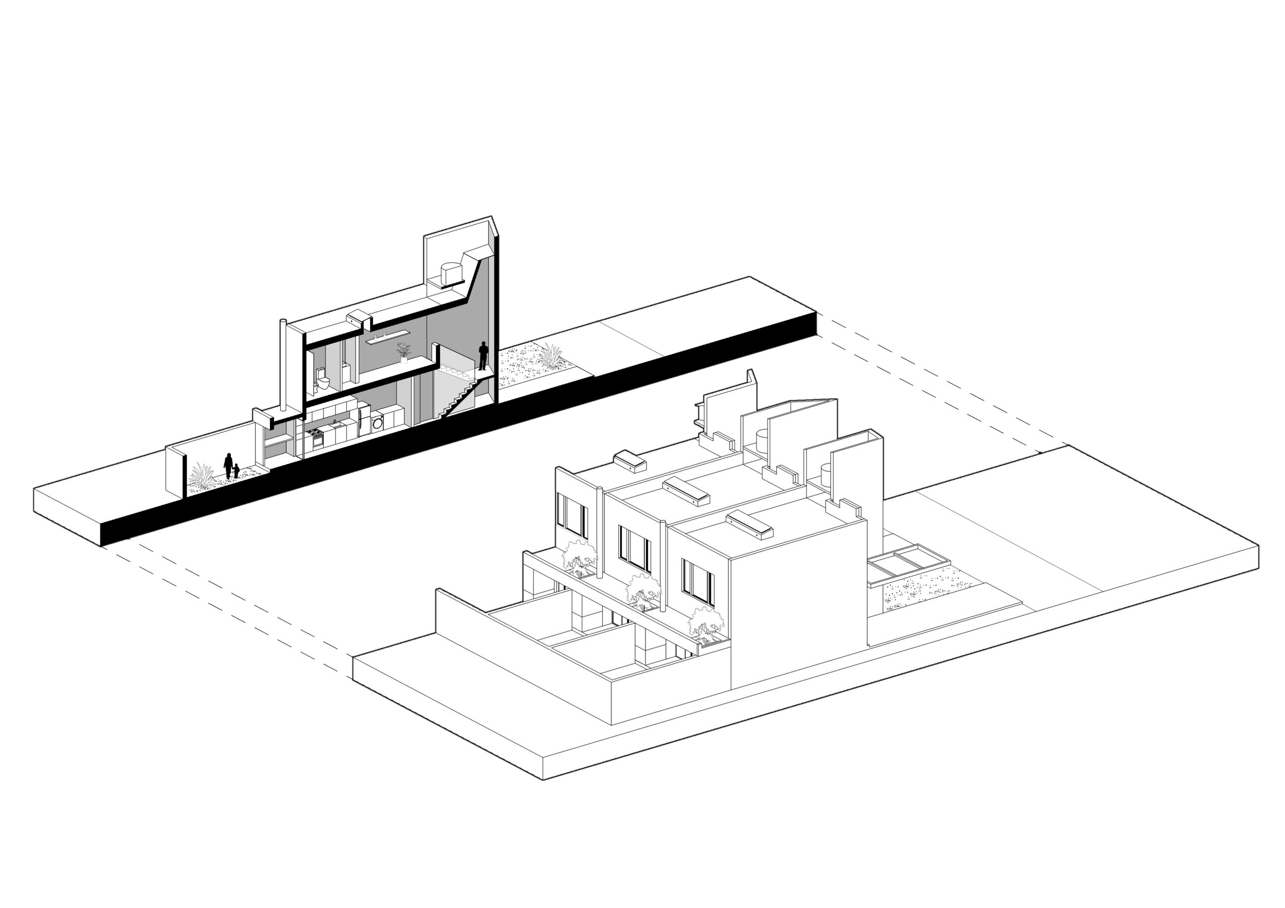 El lote se dividió en tres franjas iguales surgiendo el desafío de que unidades con fachadas relativamente pequeñas (5m de ancho) cuenten con todos los espacios necesarios para la vida diaria sin perder calidad de vida.
