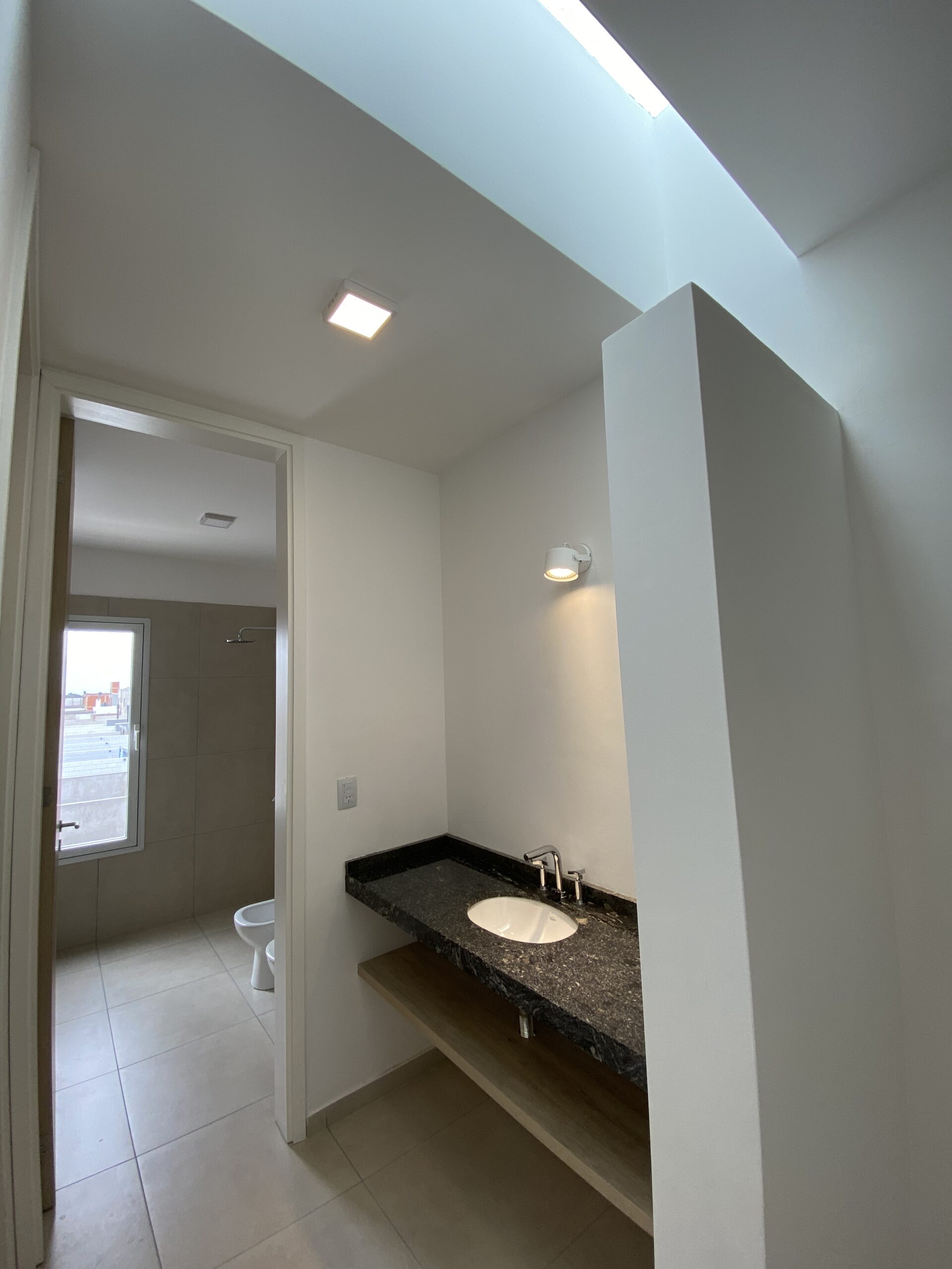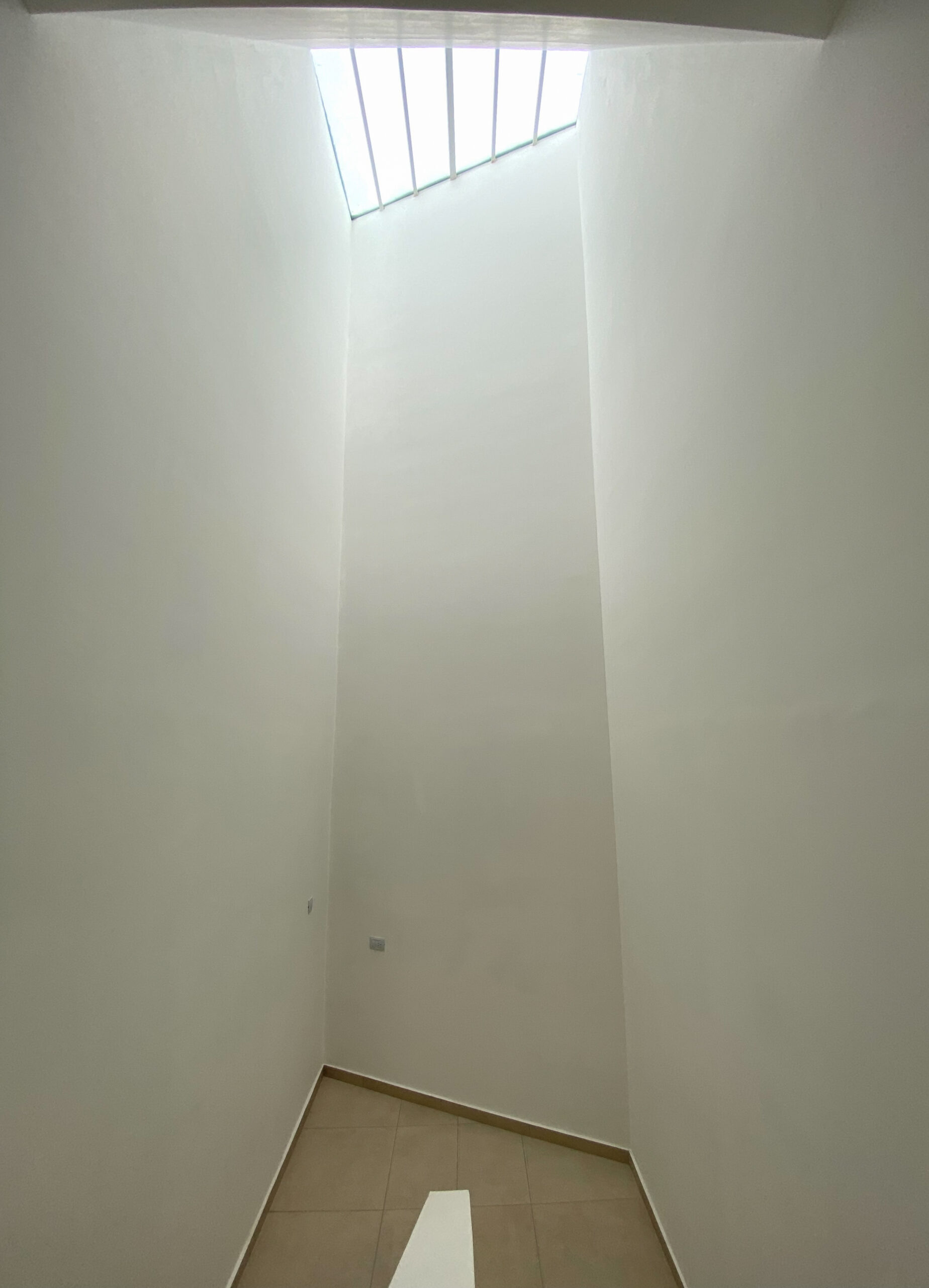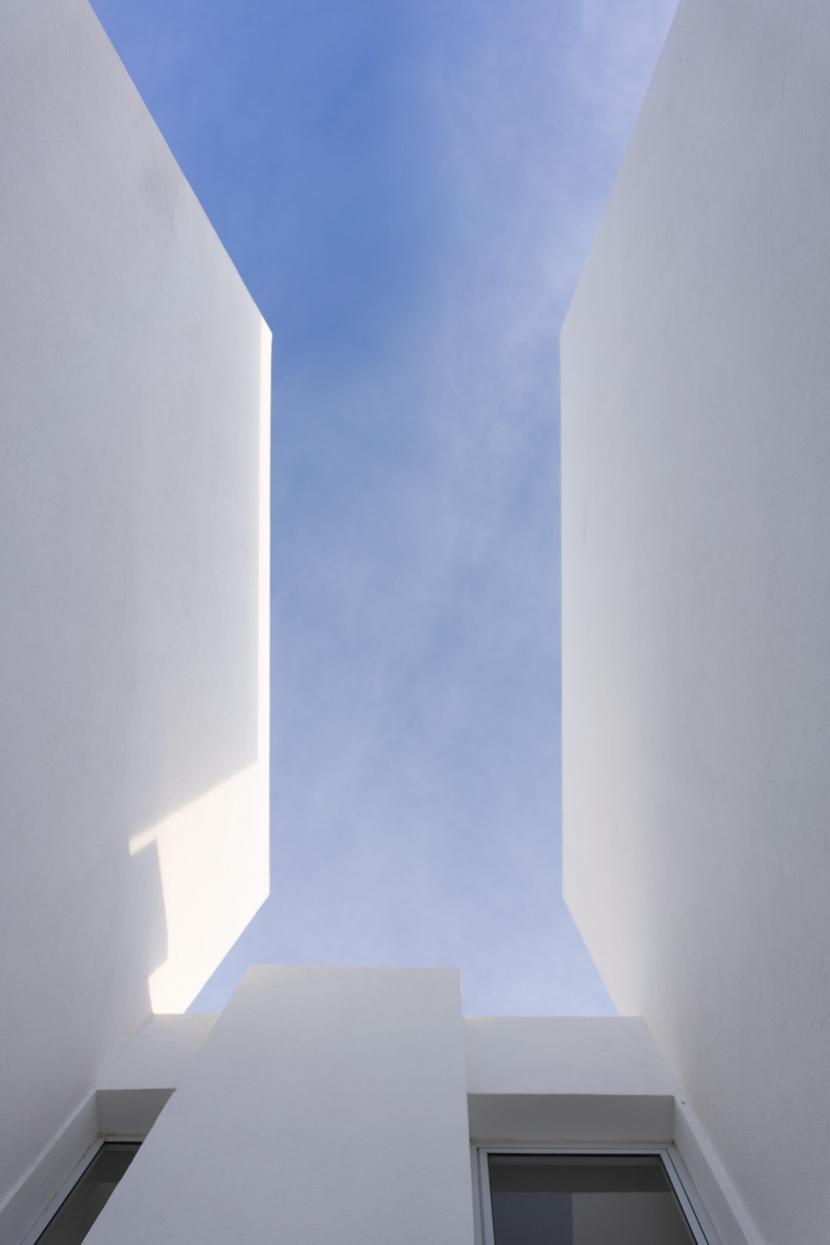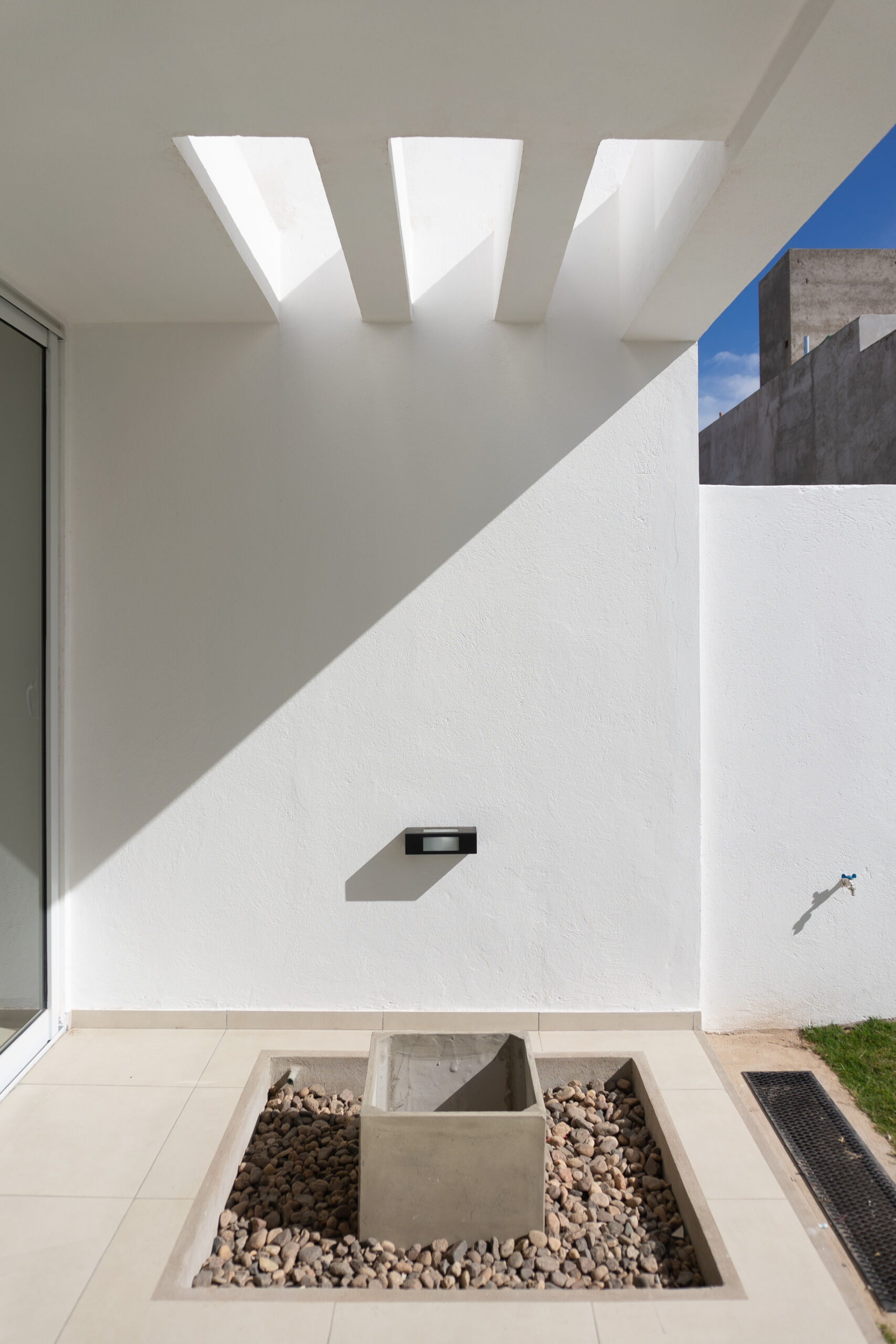 Se ubicaron dos luceras de gran tamaño, una en la caja de escaleras, siendo ésta una “ventana al cielo” en un espacio de introspección y estudio generado en el descanso de la misma y otra en la circulación de la zona intima para dotar de mejor calidad espacial, además de, evitar el uso de iluminación eléctrica durante el díA minimizando el consumo. El área pública por su parte, se abre completamente hacia el contra frente, de orientación norte recibiendo asoleamiento de calidad durante todo el año. La materialidad está dada por un sistema constructivo tradicional y local, conformada por losa de viguetas pretensadas, mampostería de ladrillos cerámicos revocados y pintura blanca de terminación para contribuir a la amplitud del espacio y para no recaer en “maquillajes” innecesarios.