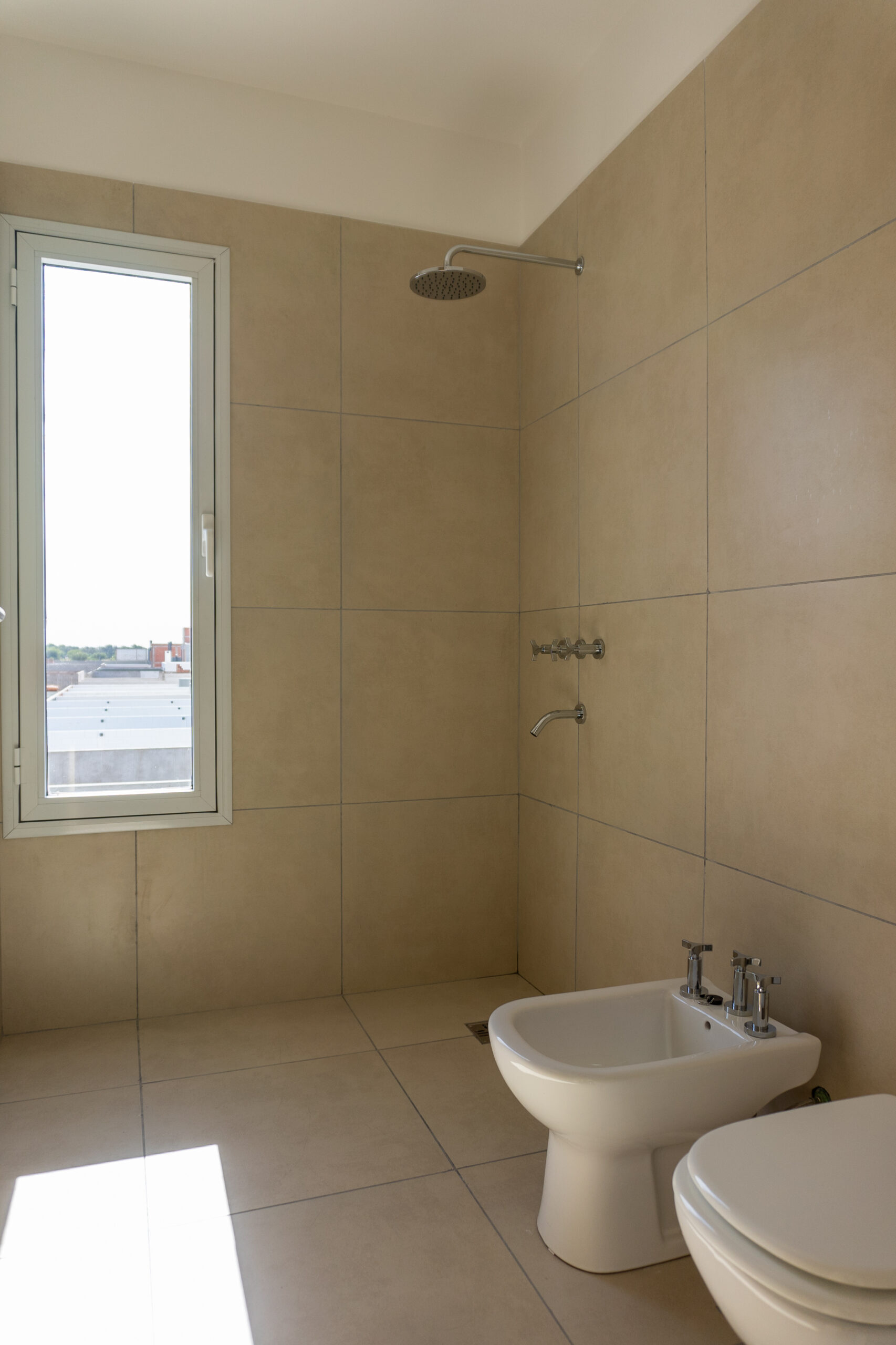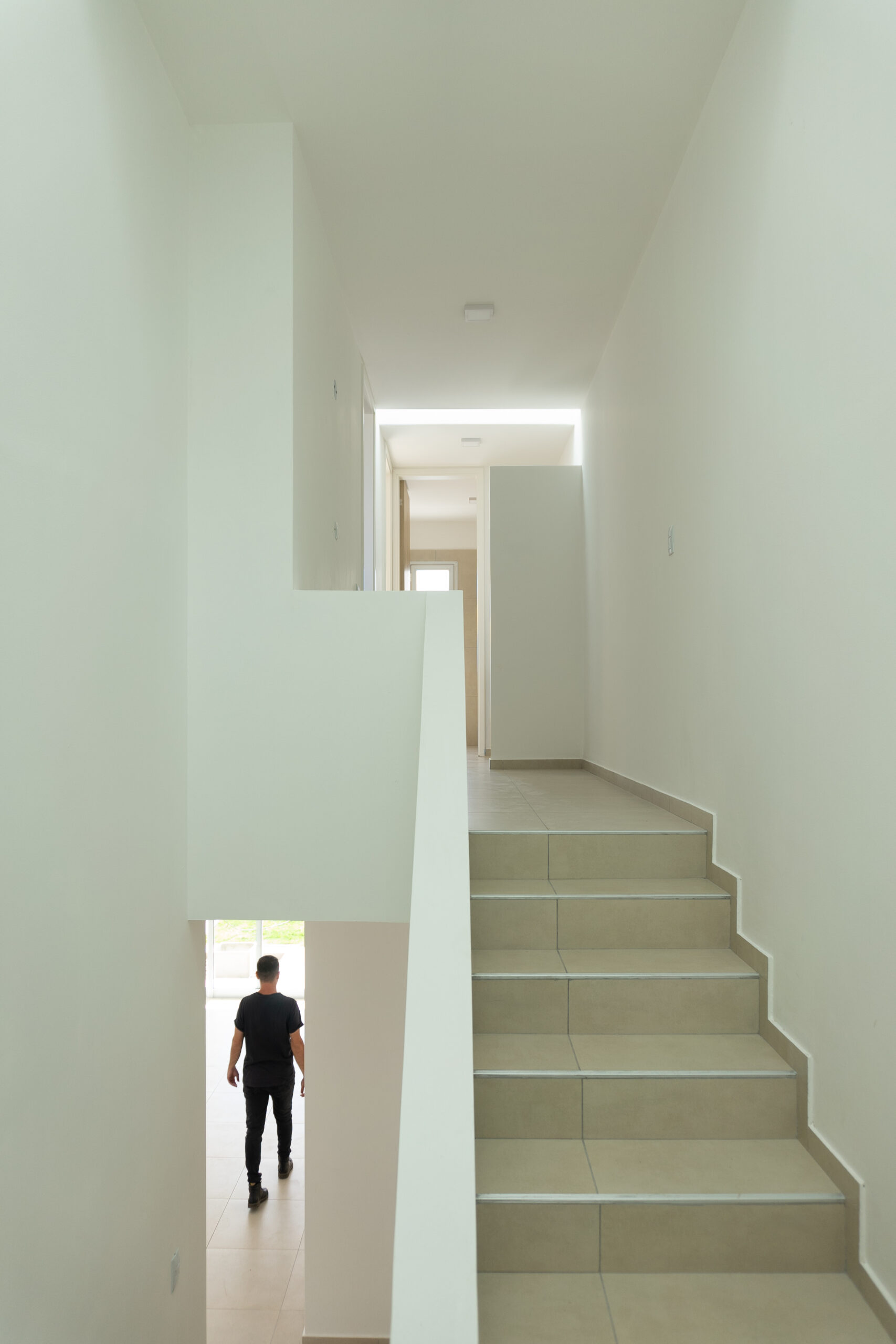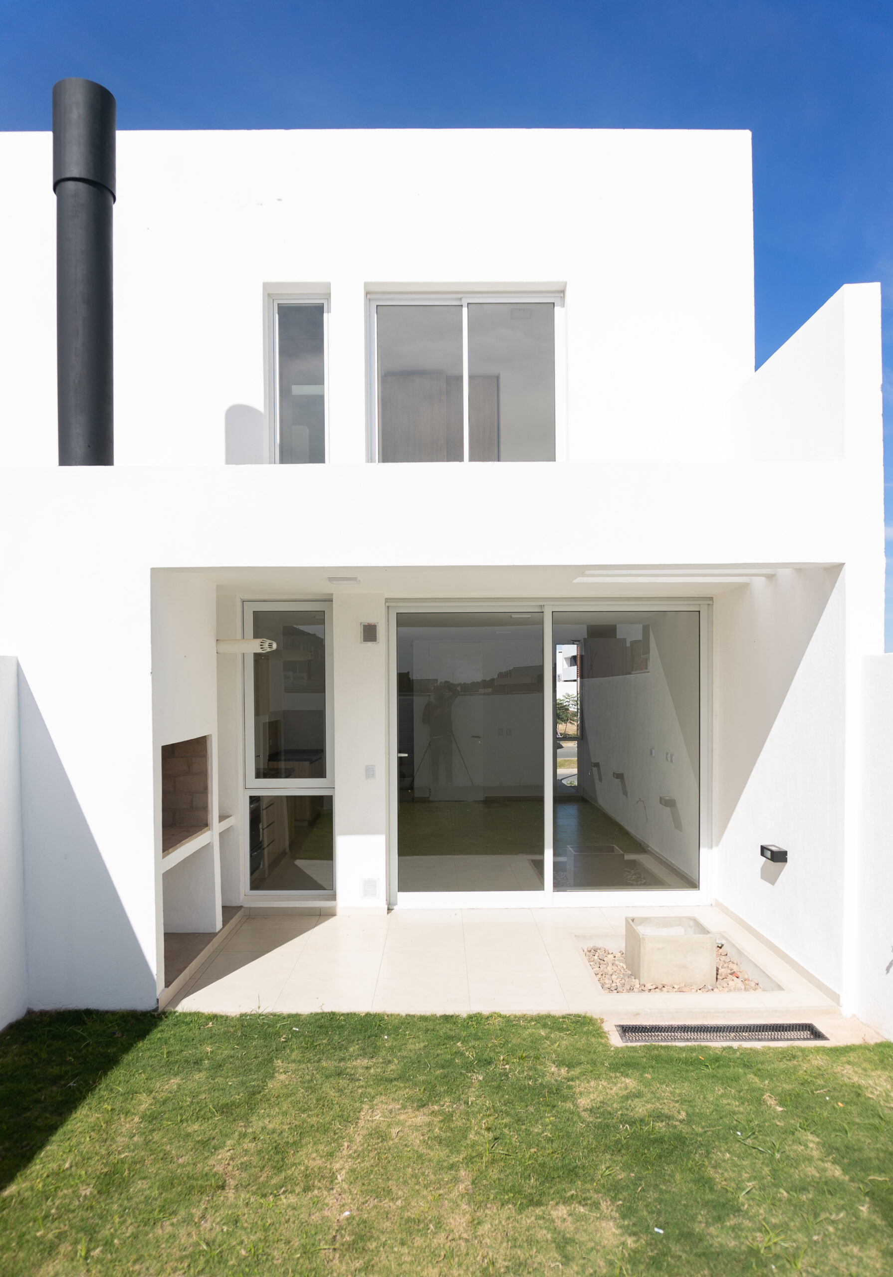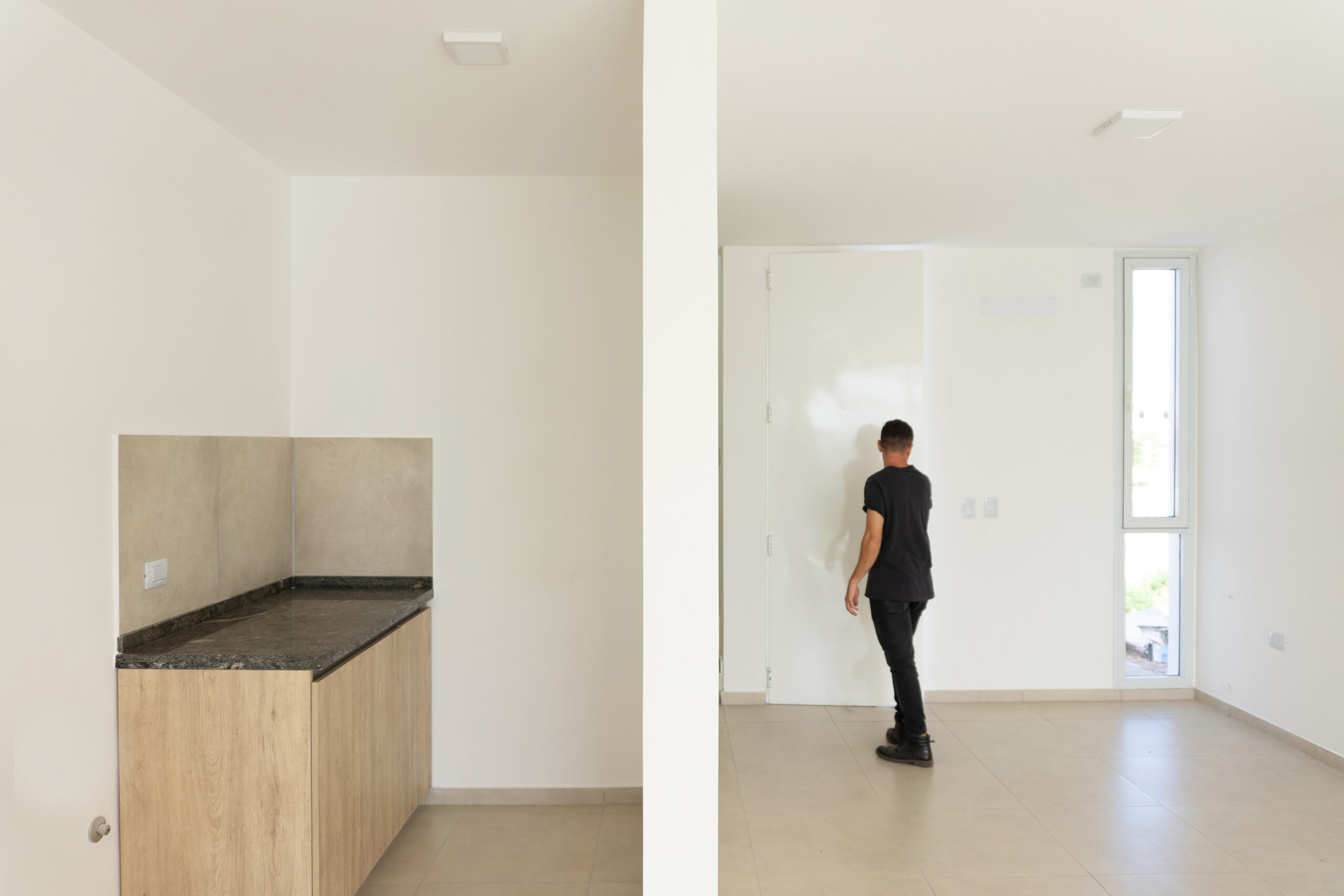 Se ubicaron dos luceras de gran tamaño, una en la caja de escaleras, siendo ésta una “ventana al cielo” en un espacio de introspección y estudio generado en el descanso de la misma y otra en la circulación de la zona intima para dotar de mejor calidad espacial, además de, evitar el uso de iluminación eléctrica durante el díA minimizando el consumo. El área pública por su parte, se abre completamente hacia el contra frente, de orientación norte recibiendo asoleamiento de calidad durante todo el año. La materialidad está dada por un sistema constructivo tradicional y local, conformada por losa de viguetas pretensadas, mampostería de ladrillos cerámicos revocados y pintura blanca de terminación para contribuir a la amplitud del espacio y para no recaer en “maquillajes” innecesarios.