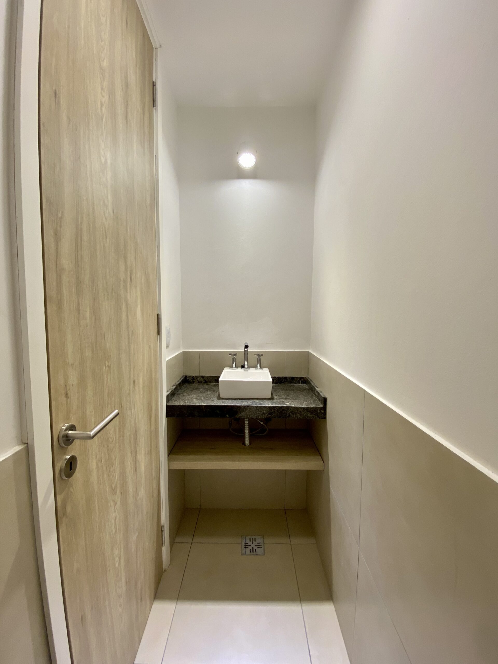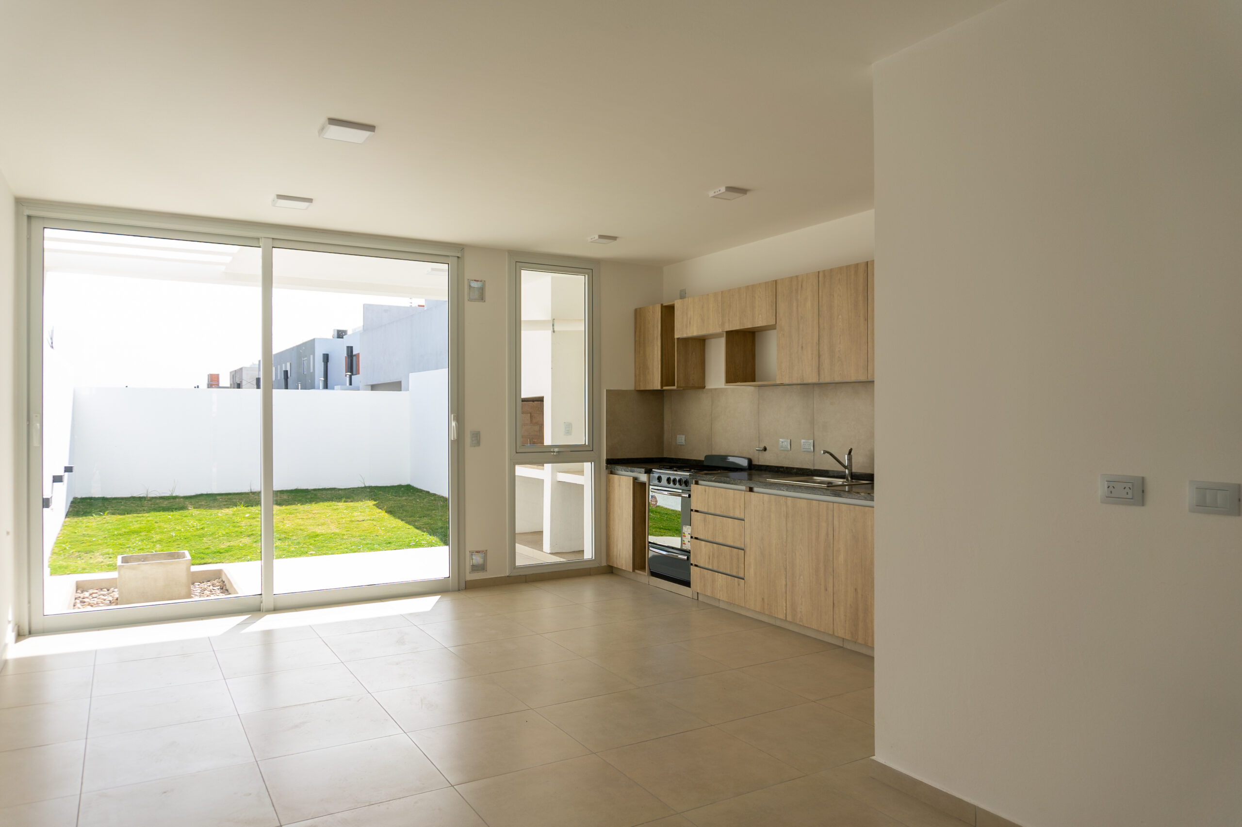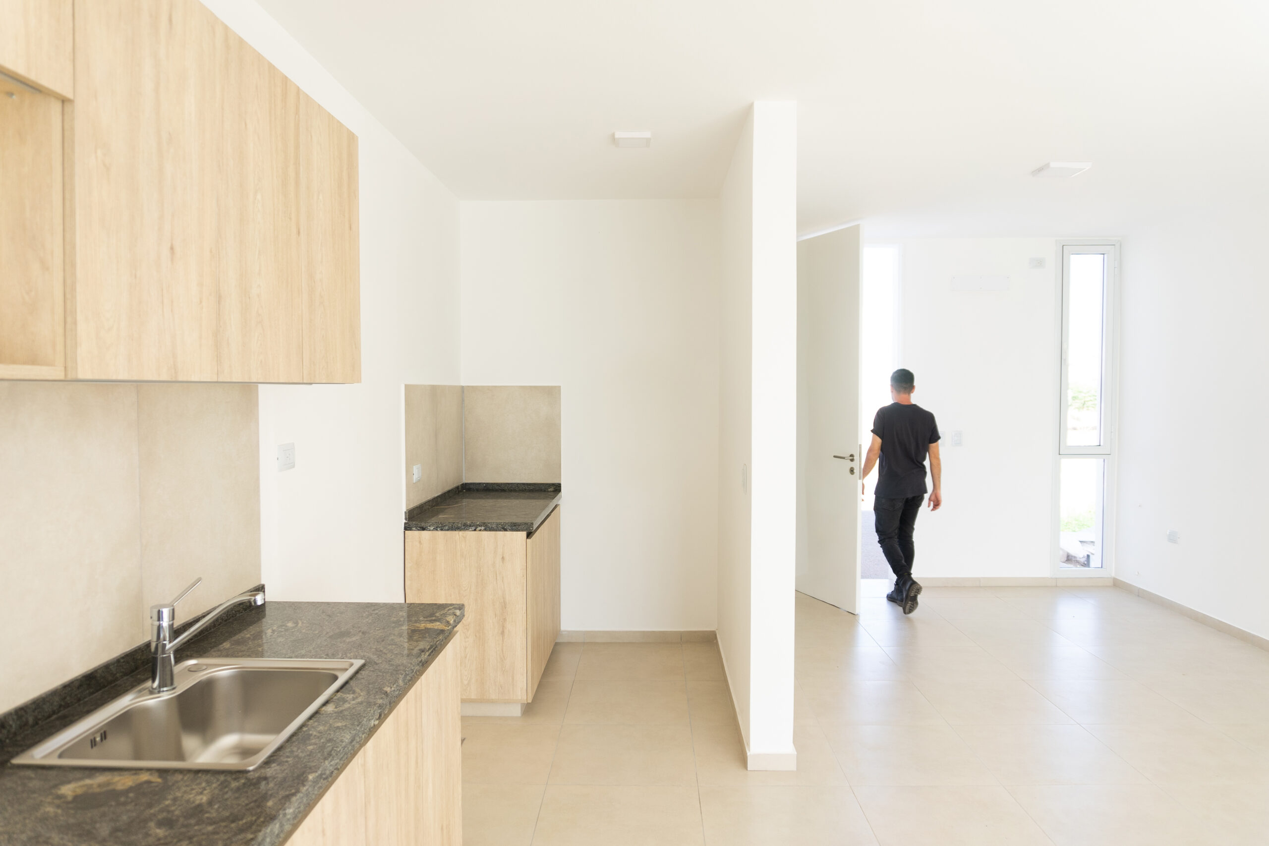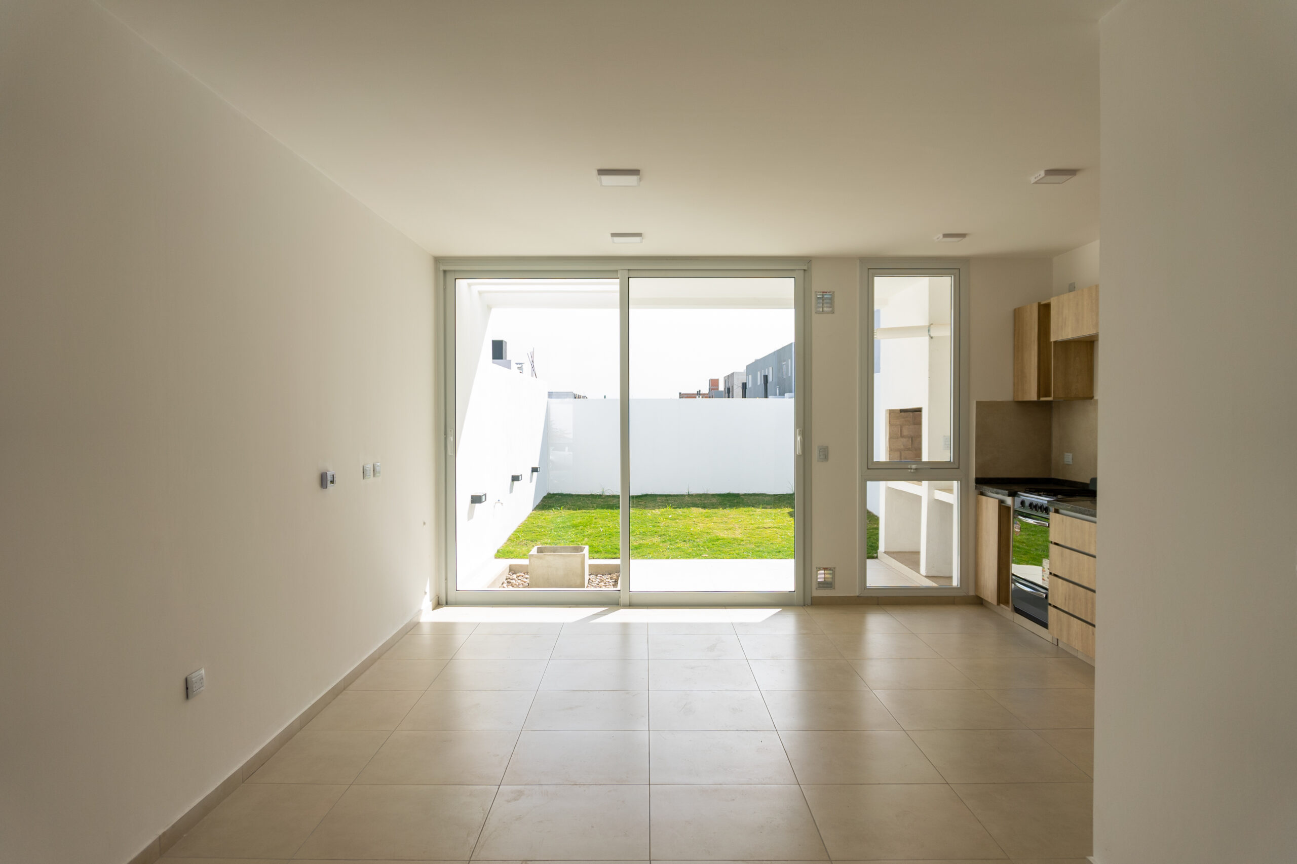 Se ubicaron dos luceras de gran tamaño, una en la caja de escaleras, siendo ésta una “ventana al cielo” en un espacio de introspección y estudio generado en el descanso de la misma y otra en la circulación de la zona intima para dotar de mejor calidad espacial, además de, evitar el uso de iluminación eléctrica durante el díA minimizando el consumo. El área pública por su parte, se abre completamente hacia el contra frente, de orientación norte recibiendo asoleamiento de calidad durante todo el año. La materialidad está dada por un sistema constructivo tradicional y local, conformada por losa de viguetas pretensadas, mampostería de ladrillos cerámicos revocados y pintura blanca de terminación para contribuir a la amplitud del espacio y para no recaer en “maquillajes” innecesarios.